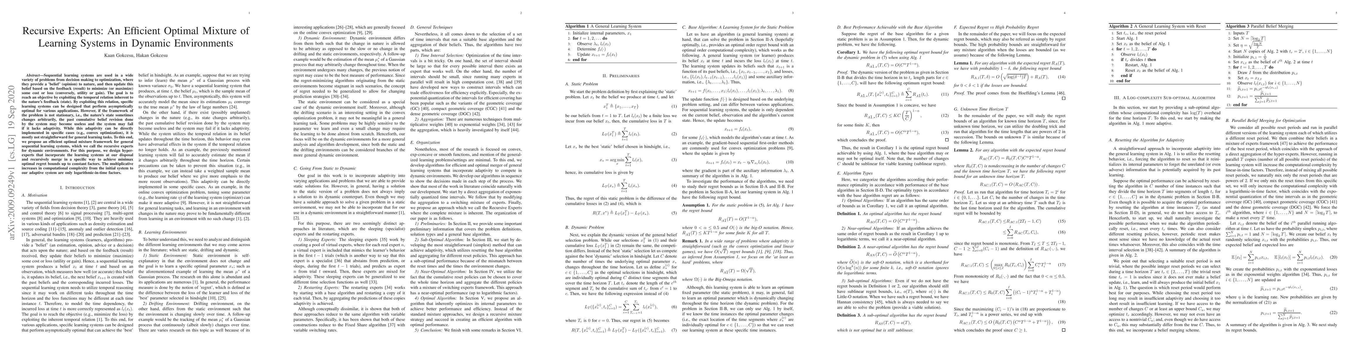 Sequential learning systems are used in a wide variety of problems from decision making to optimization, where they provide a 'belief' (opinion) to nature, and then update this belief based on the feedback (result) to minimize (or maximize) some cost or loss (conversely, utility or gain). The goal is to reach an objective by exploiting the temporal relation inherent to the nature's feedback (state). By exploiting this relation, specific learning systems can be designed that perform asymptotically optimal for various applications. However, if the framework of the problem is not stationary, i.e., the nature's state sometimes changes arbitrarily, the past cumulative belief revision done by the system may become useless and the system may fail if it lacks adaptivity. While this adaptivity can be directly implemented in specific cases (e.g., convex optimization), it is mostly not straightforward for general learning tasks. To this end, we propose an efficient optimal mixture framework for general sequential learning systems, which we call the recursive experts for dynamic environments. For this purpose, we design hyper-experts that incorporate the learning systems at our disposal and recursively merge in a specific way to achieve minimax optimal regret bounds up to constant factors. The multiplicative increases in computational complexity from the initial system to our adaptive system are only logarithmic-in-time factors.