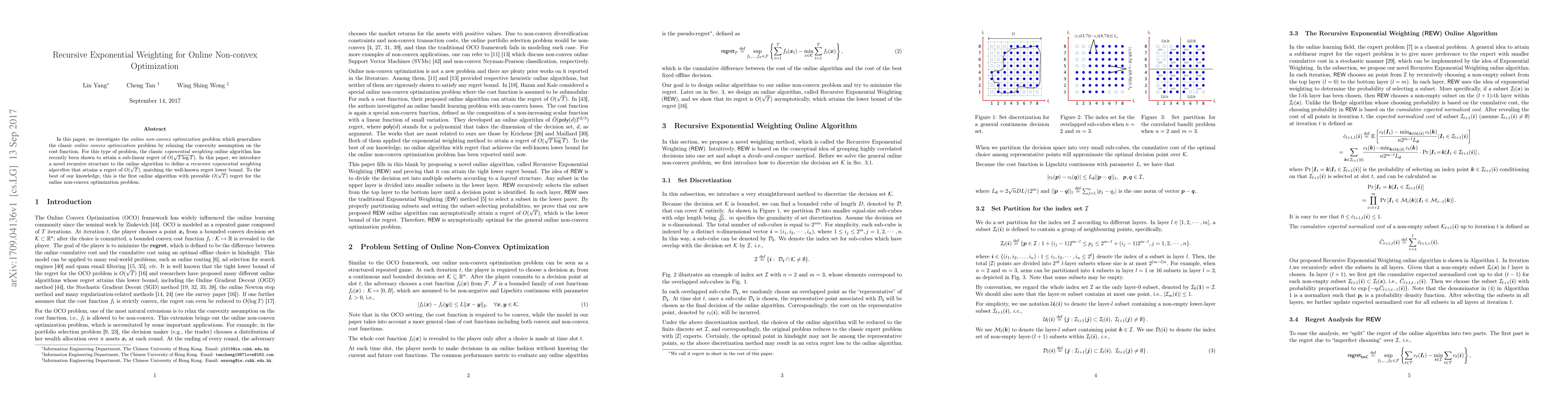 This paper proposes a novel recursive exponential weighting algorithm for online non-convex optimization, achieving a regret of $O(\sqrt{T})$, which matches the known lower bound and represents the first algorithm with such a guarantee for this problem.