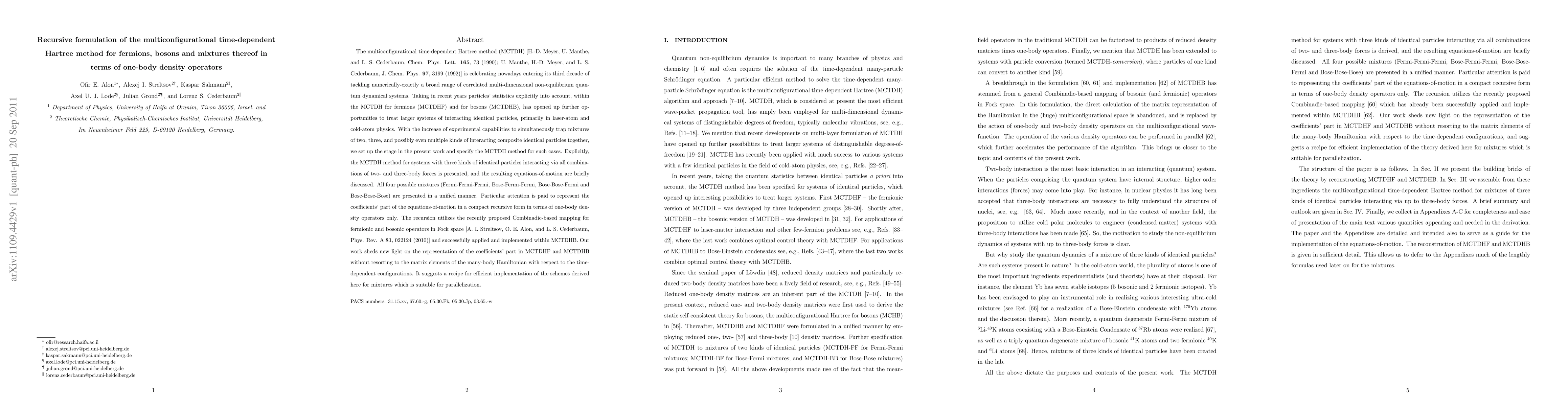 The paper extends the multiconfigurational time-dependent Hartree method to mixtures of fermions and bosons, providing a compact recursive formulation in terms of one-body density operators for efficient implementation.