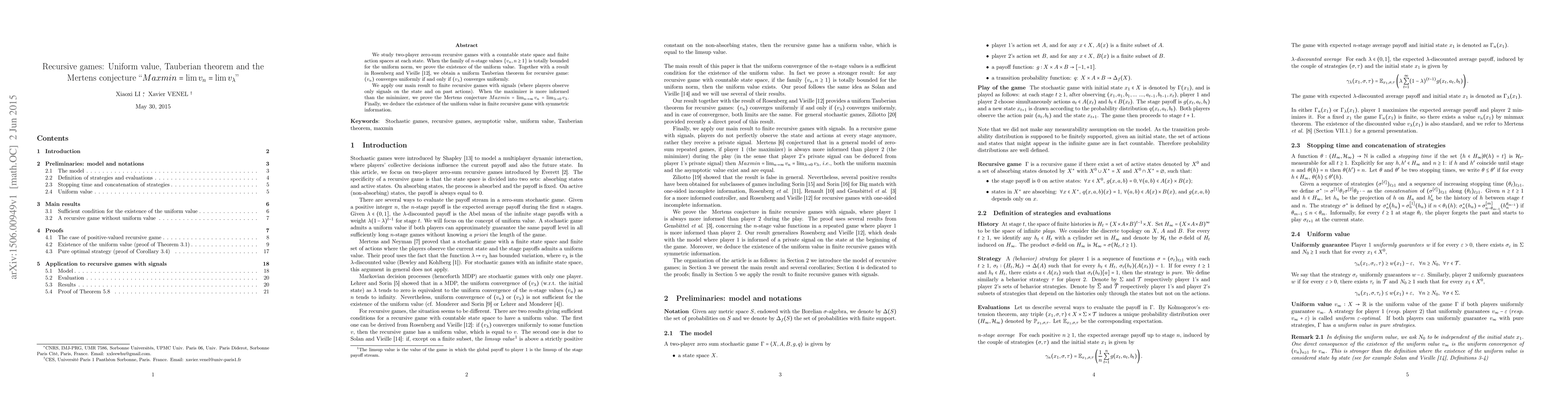 This paper proves the existence of a uniform value in recursive two-player zero-sum games and establishes a uniform Tauberian theorem. It also verifies the Mertens conjecture under conditions of asymmetric information and deduces the existence of the uniform value in games with symmetric information.