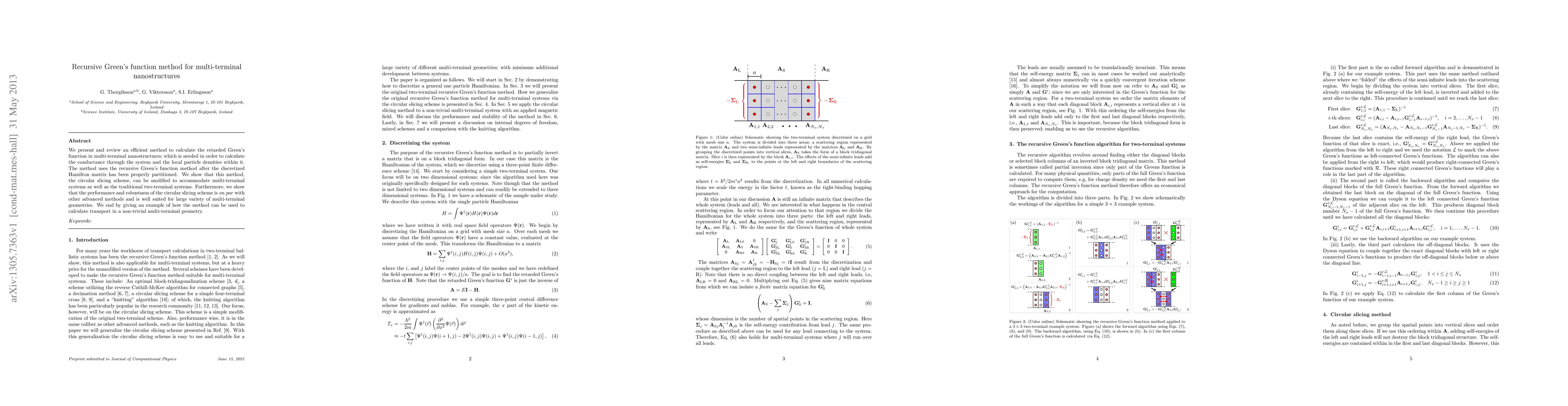 This paper introduces a recursive Green's function method for calculating the retarded Green's function in multi-terminal nanostructures, which is essential for determining conductance and local particle densities. The method, called the circular slicing scheme, is shown to be effective and comparable to other advanced techniques, making it suitable for various complex geometries.