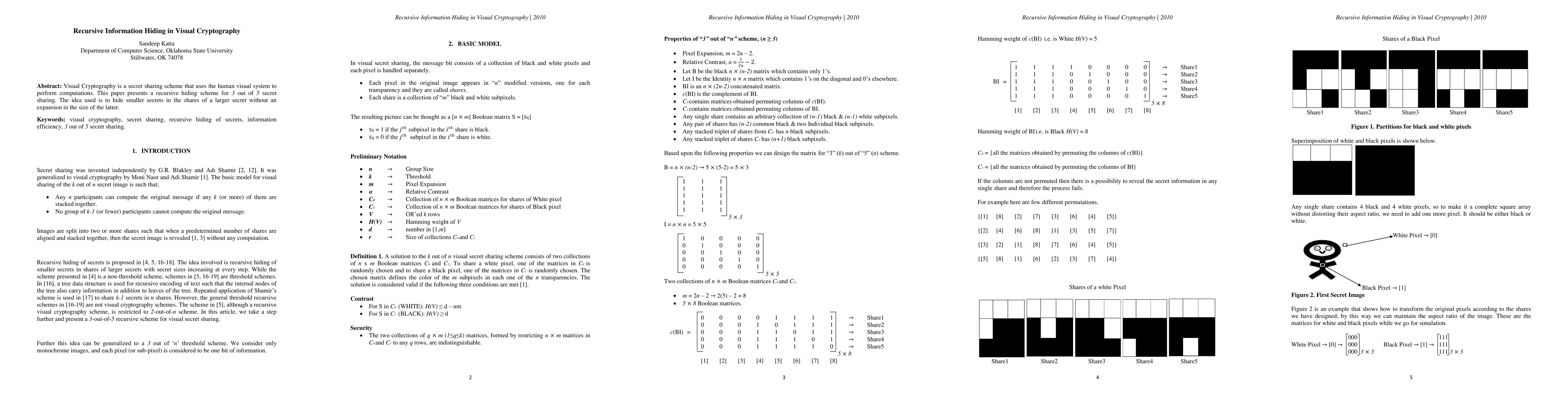 This paper introduces a recursive information hiding method in visual cryptography for 3 out of 5 secret sharing, enabling smaller secrets to be embedded within the shares of a larger secret without increasing the size of the larger secret.