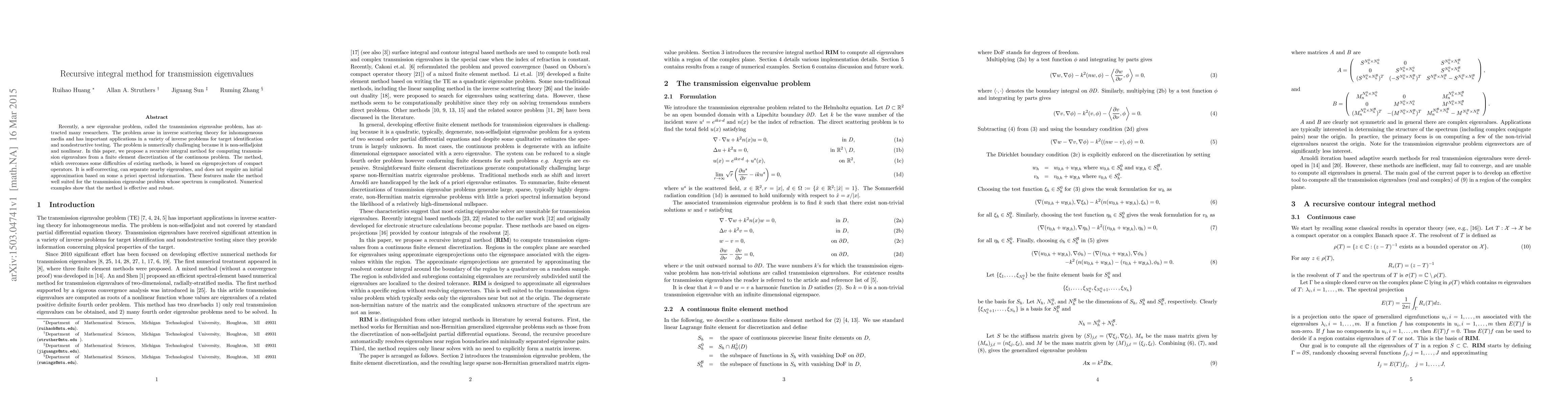 Recently, a new eigenvalue problem, called the transmission eigenvalue problem, has attracted many researchers. The problem arose in inverse scattering theory for inhomogeneous media and has important applications in a variety of inverse problems for target identification and nondestructive testing. The problem is numerically challenging because it is non-selfadjoint and nonlinear. In this paper, we propose a recursive integral method for computing transmission eigenvalues from a finite element discretization of the continuous problem. The method, which overcomes some difficulties of existing methods, is based on eigenprojectors of compact operators. It is self-correcting, can separate nearby eigenvalues, and does not require an initial approximation based on some a priori spectral information. These features make the method well suited for the transmission eigenvalue problem whose spectrum is complicated. Numerical examples show that the method is effective and robust.