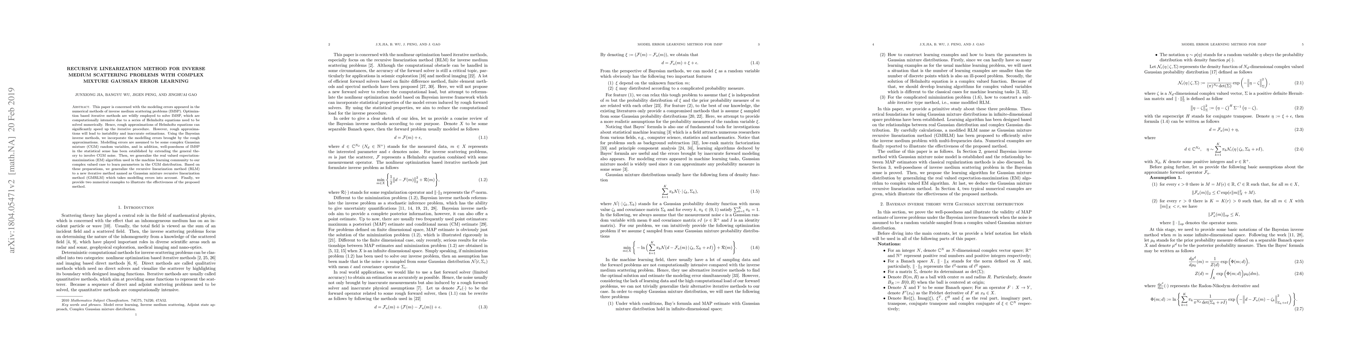 A new method, Gaussian Mixture Recursive Linearization Method (GMRLM), is proposed to solve inverse medium scattering problems with complex mixture Gaussian error learning, addressing computational intensity and instability issues.