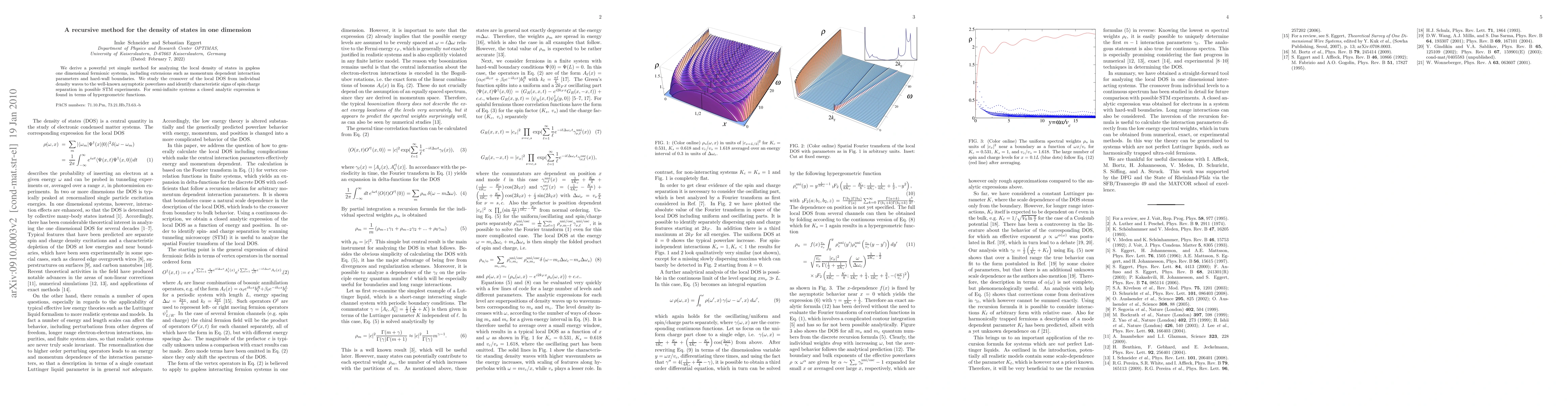 This paper introduces a recursive method for analyzing the local density of states in one-dimensional fermionic systems, revealing the transition from individual density waves to asymptotic power laws and identifying signs of spin-charge separation, with a closed analytic expression for semi-infinite systems derived using hypergeometric functions.