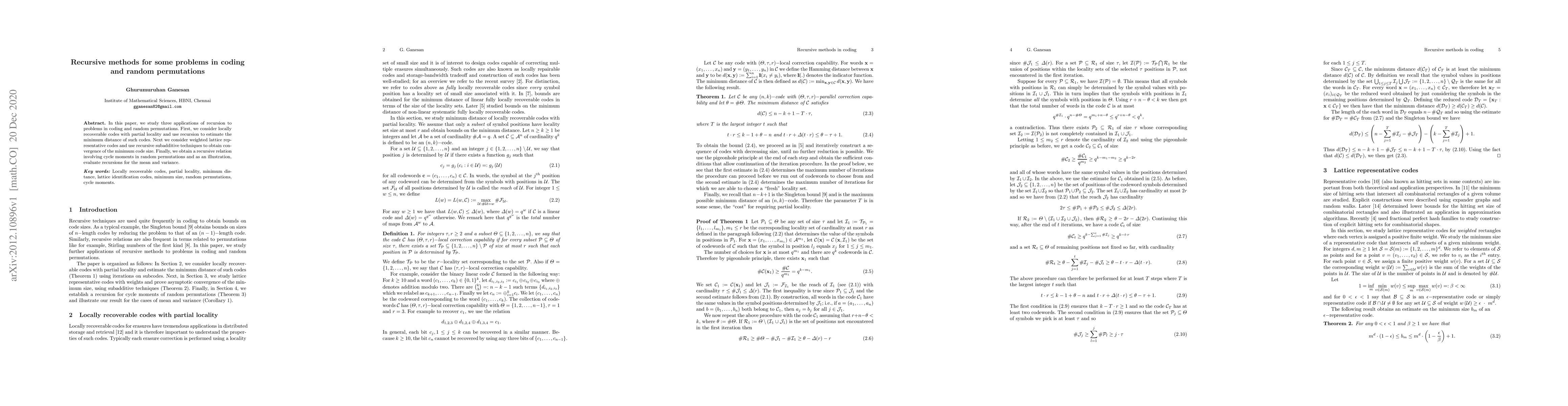 This paper applies recursive methods to estimate minimum distances of codes and analyze random permutations, with key findings including convergence of code size and cycle moments.