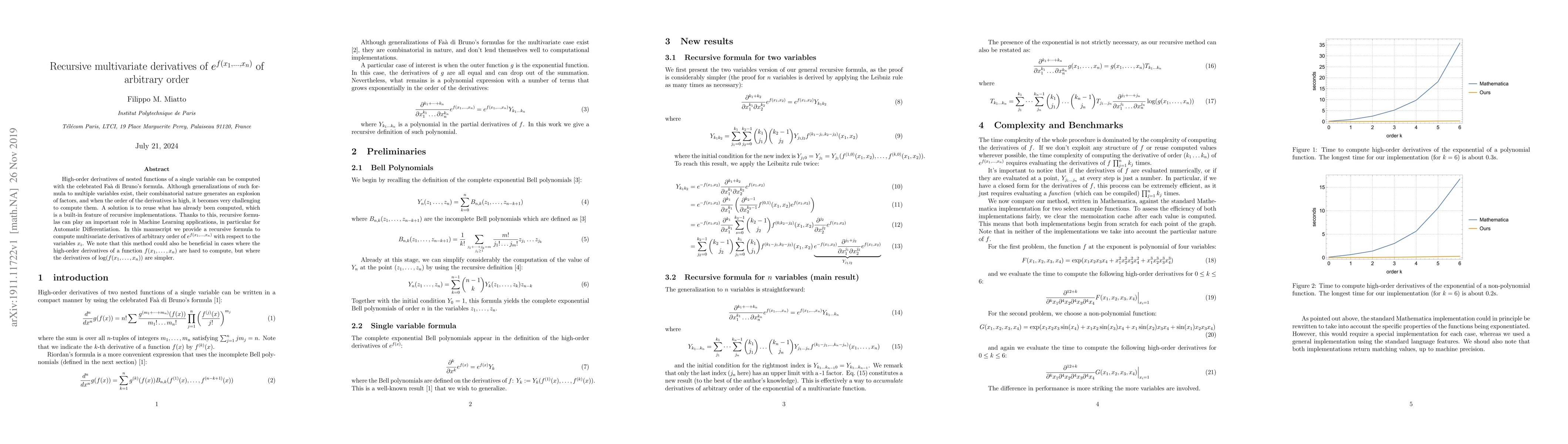 High-order derivatives of nested functions of a single variable can be computed with the celebrated Fa\`a di Bruno's formula. Although generalizations of such formula to multiple variables exist, their combinatorial nature generates an explosion of factors, and when the order of the derivatives is high, it becomes very challenging to compute them. A solution is to reuse what has already been computed, which is a built-in feature of recursive implementations. Thanks to this, recursive formulas can play an important role in Machine Learning applications, in particular for Automatic Differentiation. In this manuscript we provide a recursive formula to compute multivariate derivatives of arbitrary order of $e^{f(x_1,\dots,x_n)}$ with respect to the variables $x_i$. We note that this method could also be beneficial in cases where the high-order derivatives of a function $f(x_1,\dots,x_n)$ are hard to compute, but where the derivatives of $\log(f(x_1,\dots,x_n))$ are simpler.