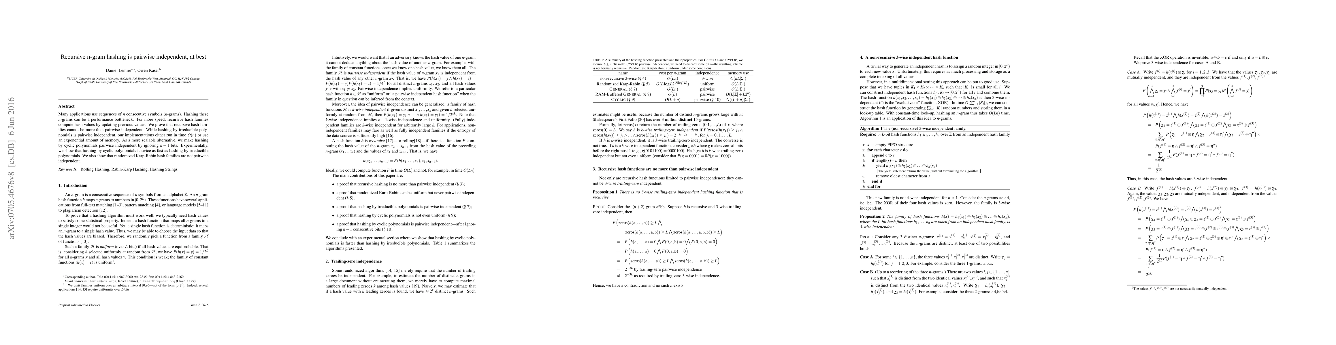 This paper discusses the limitations of recursive hash families for n-grams, proving they cannot exceed pairwise independence. It proposes cyclic polynomial hashing as a scalable alternative, demonstrating it is twice as fast as irreducible polynomial hashing while maintaining pairwise independence.