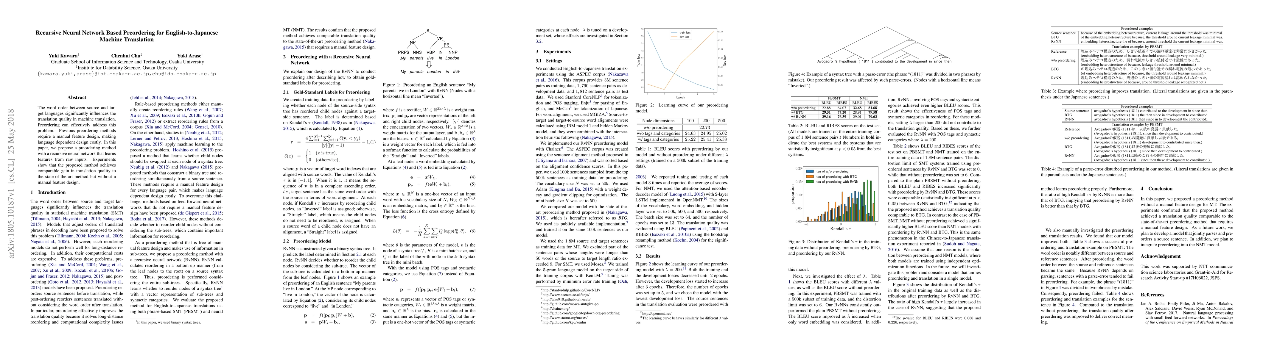 This paper proposes a recursive neural network-based preordering method for English-to-Japanese machine translation, which automatically learns features from raw inputs, improving translation quality without manual feature design. Experimental results show it achieves comparable gains to state-of-the-art methods.