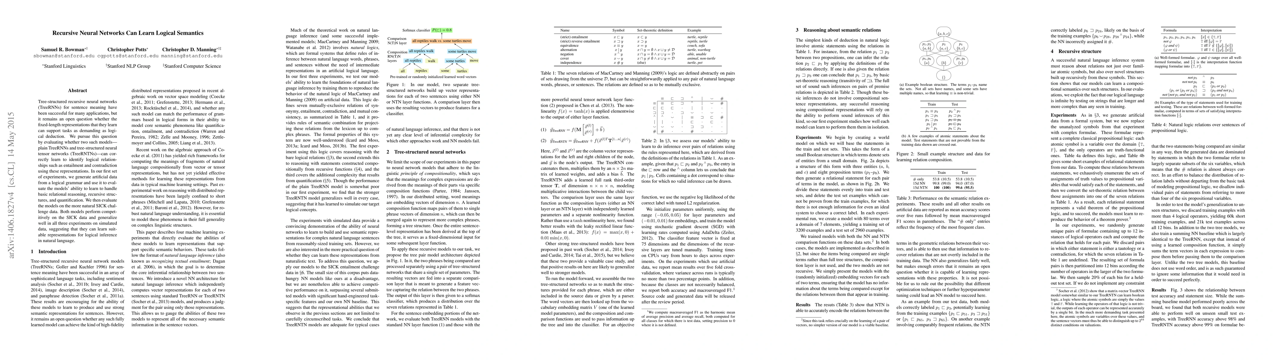 Tree-structured recursive neural networks (TreeRNNs) for sentence meaning have been successful for many applications, but it remains an open question whether the fixed-length representations that they learn can support tasks as demanding as logical deduction. We pursue this question by evaluating whether two such models---plain TreeRNNs and tree-structured neural tensor networks (TreeRNTNs)---can correctly learn to identify logical relationships such as entailment and contradiction using these representations. In our first set of experiments, we generate artificial data from a logical grammar and use it to evaluate the models' ability to learn to handle basic relational reasoning, recursive structures, and quantification. We then evaluate the models on the more natural SICK challenge data. Both models perform competitively on the SICK data and generalize well in all three experiments on simulated data, suggesting that they can learn suitable representations for logical inference in natural language.