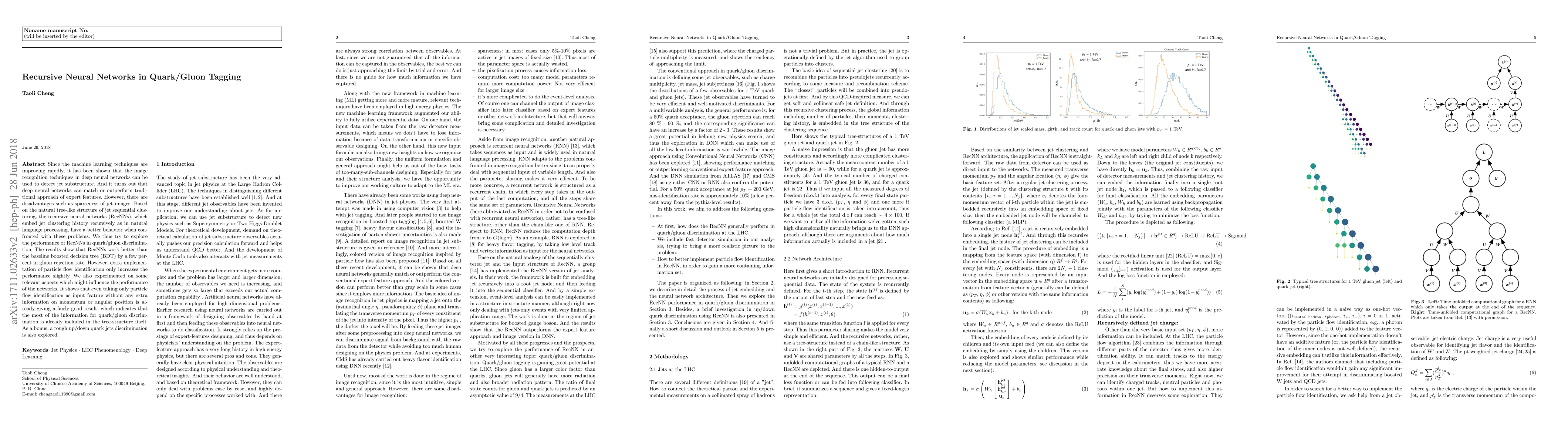 A novel approach using recursive neural networks was developed and implemented for quark/gluon jet discrimination