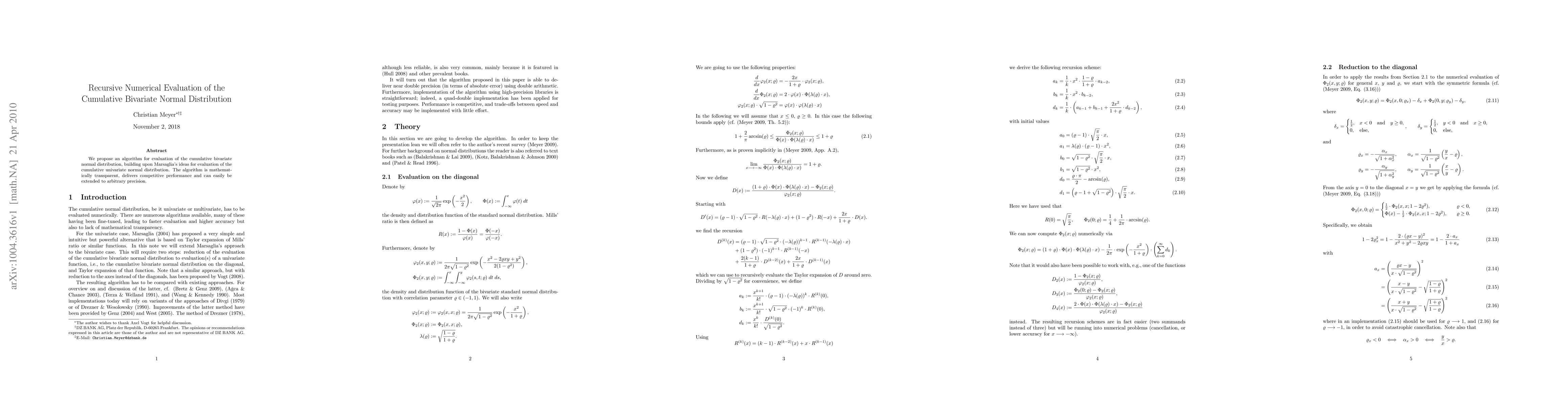 Summary: This paper introduces a recursive algorithm for evaluating the cumulative bivariate normal distribution, leveraging Marsaglia's univariate method, offering both mathematical clarity and competitive computational performance, with potential for arbitrary precision extension.