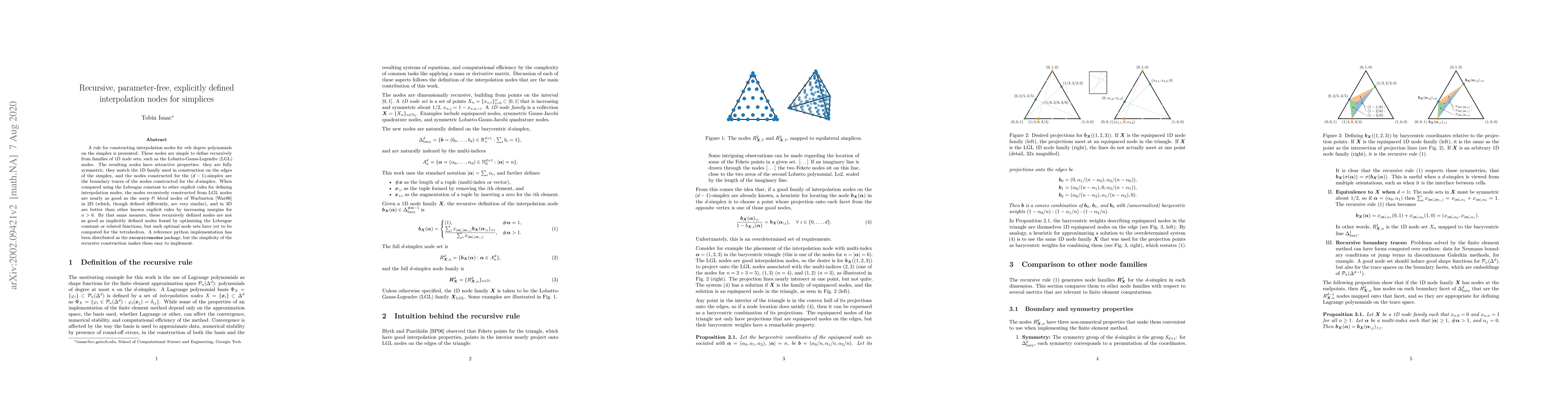 A rule for constructing interpolation nodes for $n$th degree polynomials on the simplex is presented. These nodes are simple to define recursively from families of 1D node sets, such as the Lobatto-Gauss-Legendre (LGL) nodes. The resulting nodes have attractive properties: they are fully symmetric, they match the 1D family used in construction on the edges of the simplex, and the nodes constructed for the $(d-1)$-simplex are the boundary traces of the nodes constructed for the $d$-simplex. When compared using the Lebesgue constant to other explicit rules for defining interpolation nodes, the nodes recursively constructed from LGL nodes are nearly as good as the "warp & blend" nodes of Warburton in 2D (which, though defined differently, are very similar), and in 3D are better than other known explicit rules by increasing margins for $n > 6$. By that same measure, these recursively defined nodes are not as good as implicitly defined nodes found by optimizing the Lebesgue constant or related functions, but such optimal node sets have yet to be computed for the tetrahedron. A reference python implementation has been distributed as the `recursivenodes` package, but the simplicity of the recursive construction makes them easy to implement.
