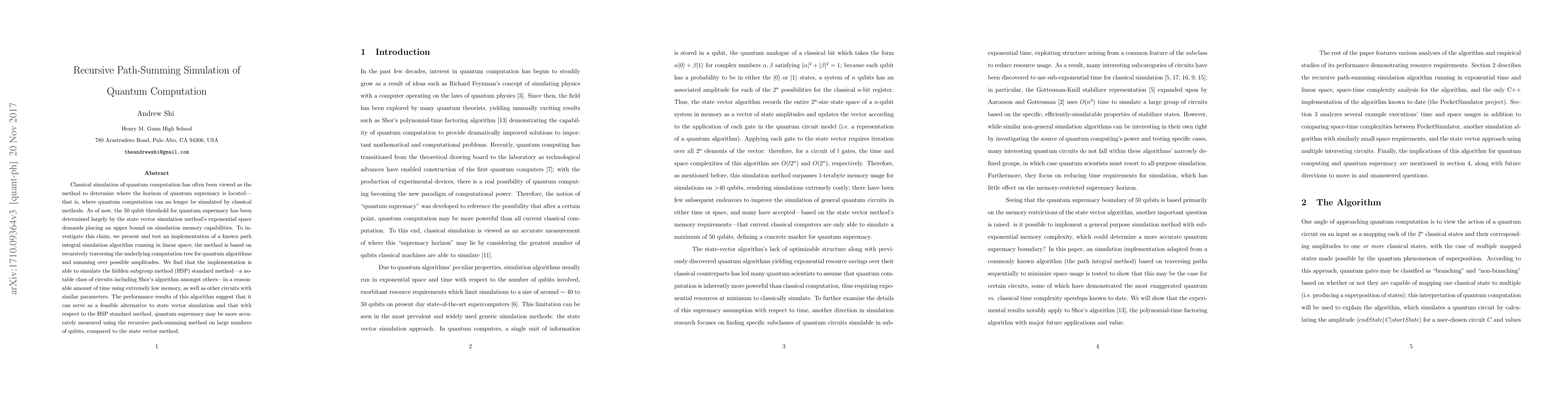 This paper proposes a recursive path-summing simulation algorithm for quantum computation that operates in linear space, contrasting with the exponential space demands of state vector simulation. The method successfully simulates the hidden subgroup method, including Shor's algorithm, using low memory and reasonable time, suggesting it as a viable alternative to state vector simulation for measuring quantum supremacy.