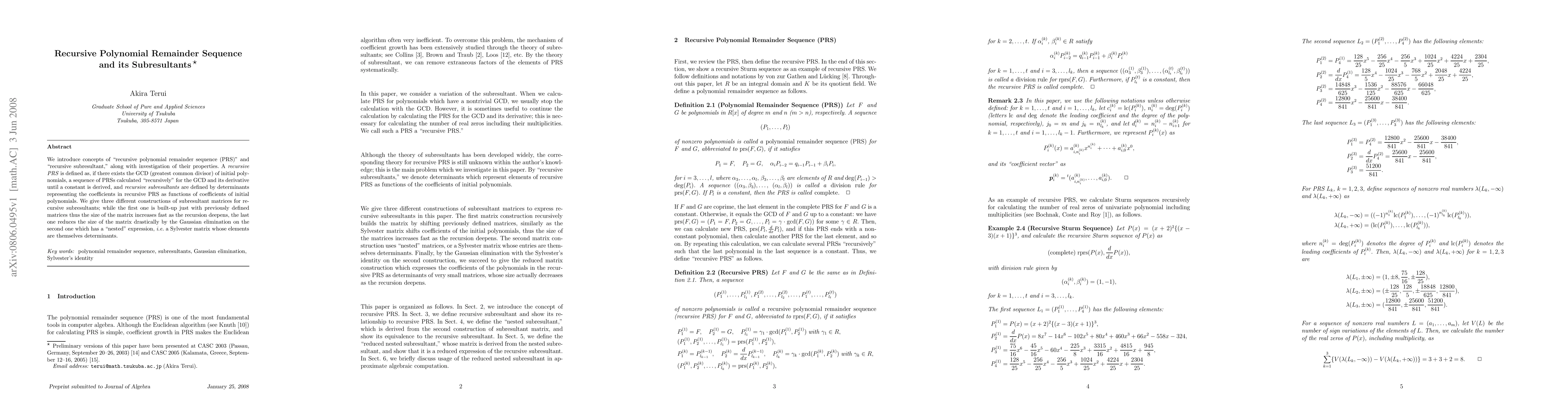 This paper introduces the concept of recursive polynomial remainder sequences (PRS) and recursive subresultants, exploring their properties and constructions. It presents three different methods for constructing subresultant matrices, with the last method significantly reducing matrix size through Gaussian elimination.