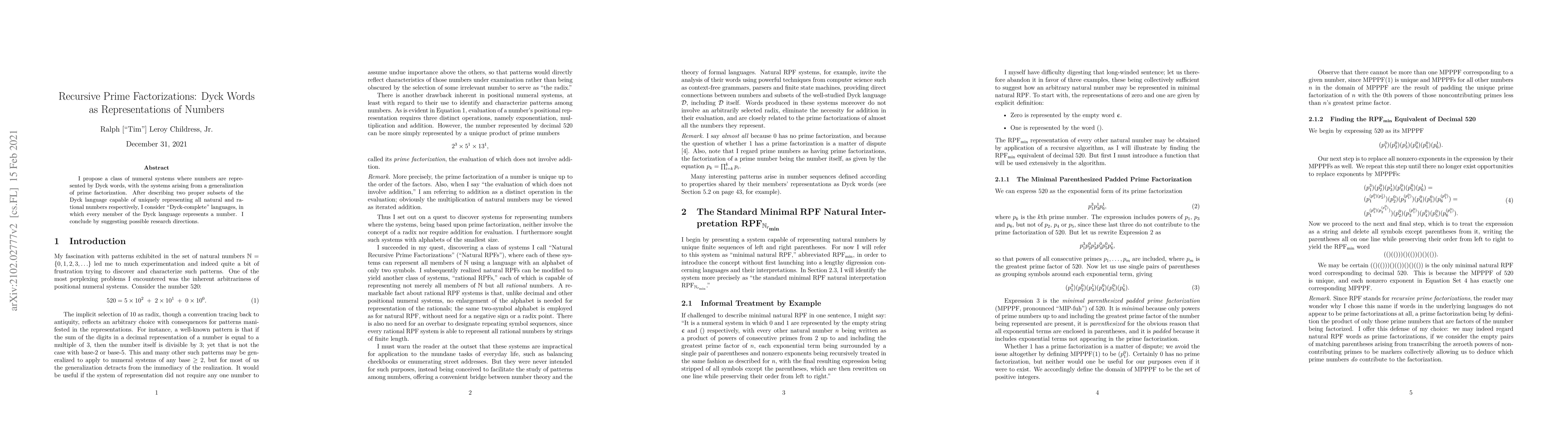 This paper introduces numeral systems using Dyck words, generalizing prime factorization, and identifies subsets that uniquely represent natural and rational numbers. It explores "Dyck-complete" languages where every Dyck word corresponds to a number, and proposes future research avenues.
