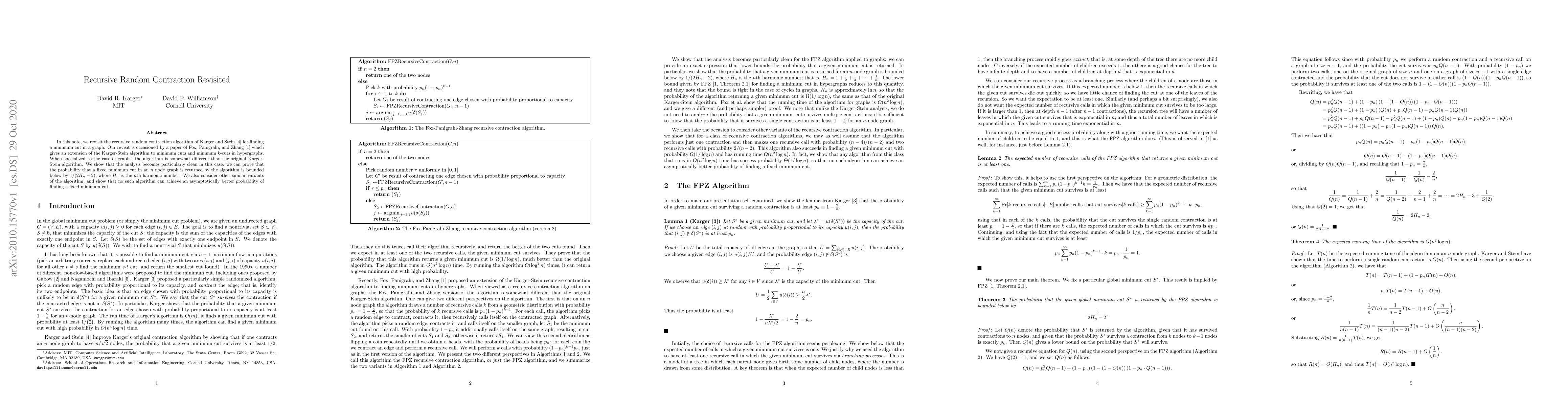 In this note, we revisit the recursive random contraction algorithm of Karger and Stein for finding a minimum cut in a graph. Our revisit is occasioned by a paper of Fox, Panigrahi, and Zhang which gives an extension of the Karger-Stein algorithm to minimum cuts and minimum $k$-cuts in hypergraphs. When specialized to the case of graphs, the algorithm is somewhat different than the original Karger-Stein algorithm. We show that the analysis becomes particularly clean in this case: we can prove that the probability that a fixed minimum cut in an $n$ node graph is returned by the algorithm is bounded below by $1/(2H_n-2)$, where $H_n$ is the $n$th harmonic number. We also consider other similar variants of the algorithm, and show that no such algorithm can achieve an asymptotically better probability of finding a fixed minimum cut.