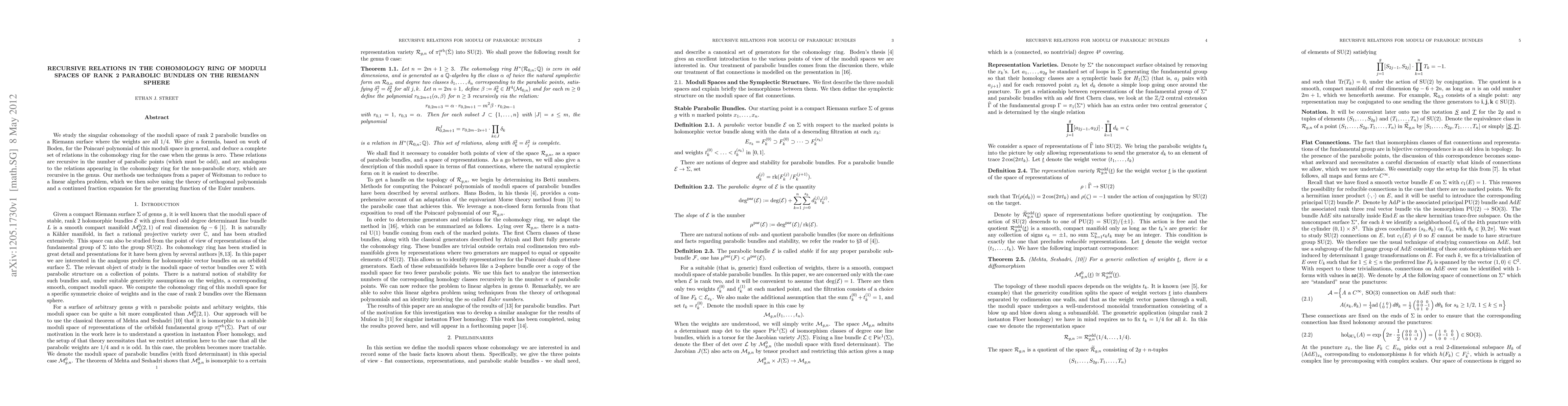 We study the singular cohomology of the moduli space of rank 2 parabolic bundles on a Riemann surface where the weights are all 1/4. We give a formula, based on work of Boden, for the Poincar\'e polynomial of this moduli space in general, and deduce a complete set of relations in the cohomology ring for the case when the genus is zero. These relations are recursive in the number of parabolic points (which must be odd), and are analogous to the relations appearing in the cohomology ring for the non-parabolic story, which are recursive in the genus. Our methods use techniques from a paper of Weitsman to reduce to a linear algebra problem, which we then solve using the theory of orthogonal polynomials and a continued fraction expansion for the generating function of the Euler numbers.