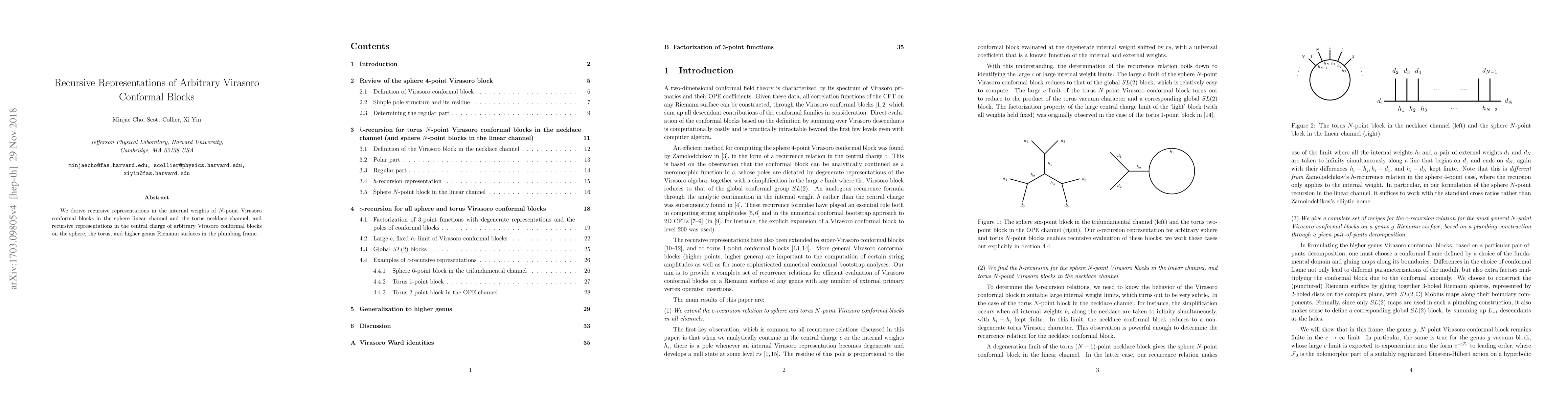 We derive recursive representations in the internal weights of N-point Virasoro conformal blocks in the sphere linear channel and the torus necklace channel, and recursive representations in the central charge of arbitrary Virasoro conformal blocks on the sphere, the torus, and higher genus Riemann surfaces in the plumbing frame.