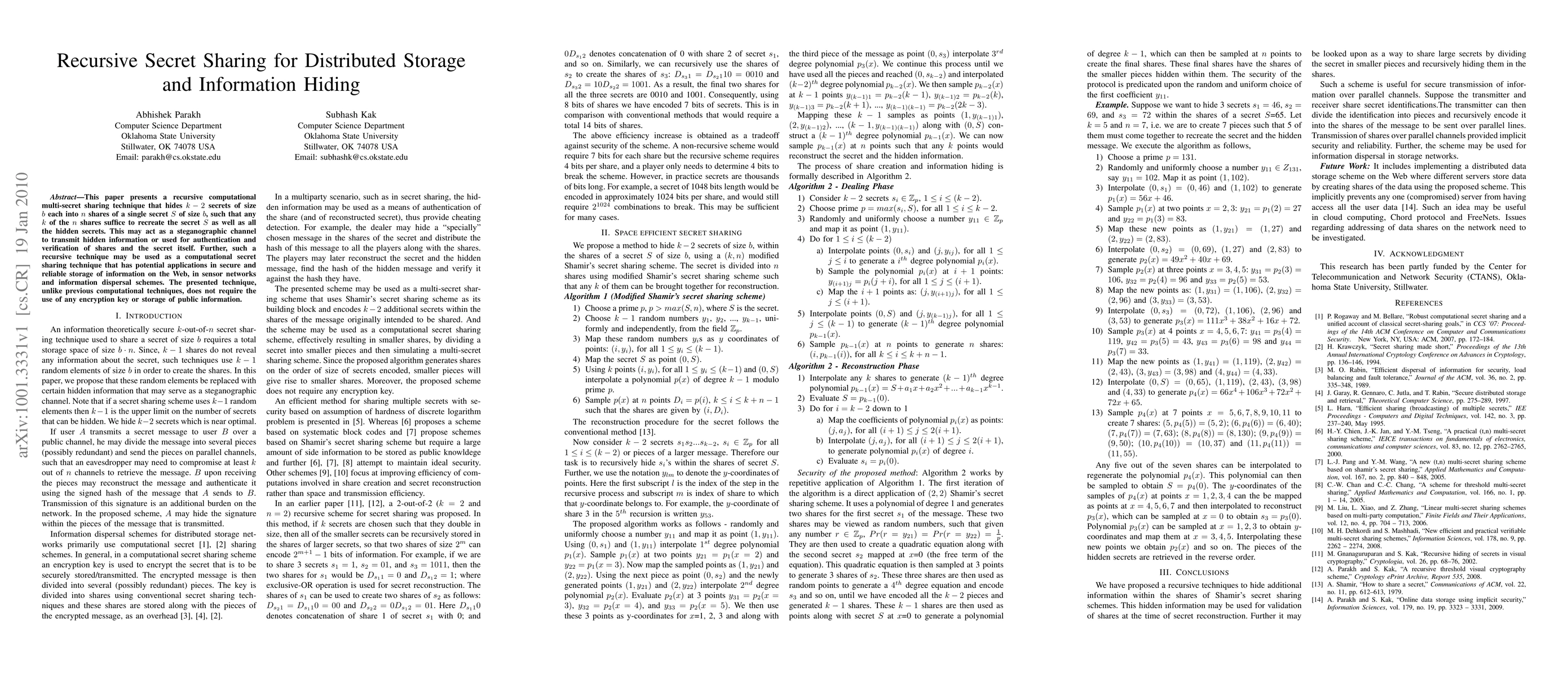 This paper introduces a recursive multi-secret sharing method that embeds k-2 hidden secrets into n shares of a single secret, enabling reconstruction of both the main and hidden secrets with any k shares. It offers a keyless, steganographic approach for secure information storage and verification in distributed systems.