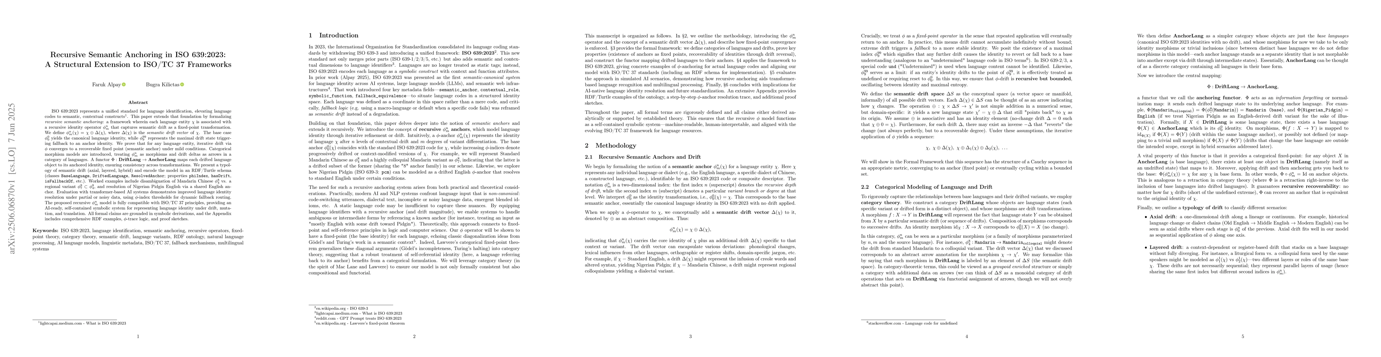 This paper proposes a method to handle dialectal drift and creole mixtures in ISO 639:2023 using recursive semantic anchoring. It introduces fixed-point operators to model bounded semantic drift and demonstrates improved language identification and translation accuracy in transformer models when using these indices for fallback routing. The framework is compatible with ISO/TC 37 and provides a drift-aware semantic layer for future language standards.
