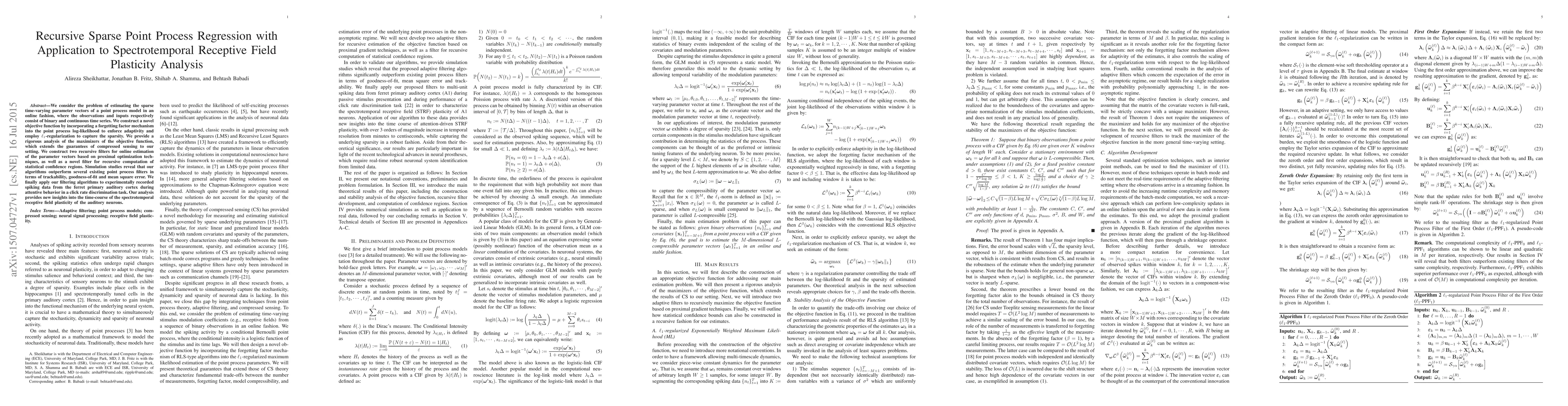 This paper proposes a recursive sparse point process regression method for online estimation of time-varying parameters, incorporating a forgetting factor and $\ell_1$-regularization. The method is applied to analyze plasticity in the spectrotemporal receptive fields of ferret auditory neurons, revealing new insights into neural adaptation.