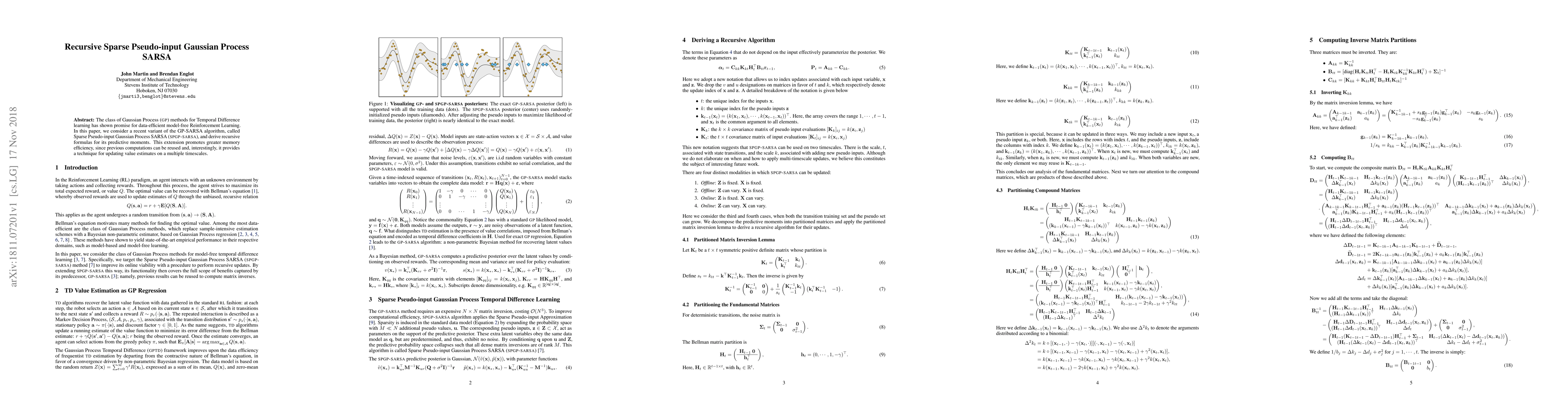 This paper introduces recursive formulas for the Sparse Pseudo-input Gaussian Process SARSA (SPGP-SARSA) algorithm, enhancing memory efficiency through reuse of previous computations and enabling value estimate updates on multiple timescales.