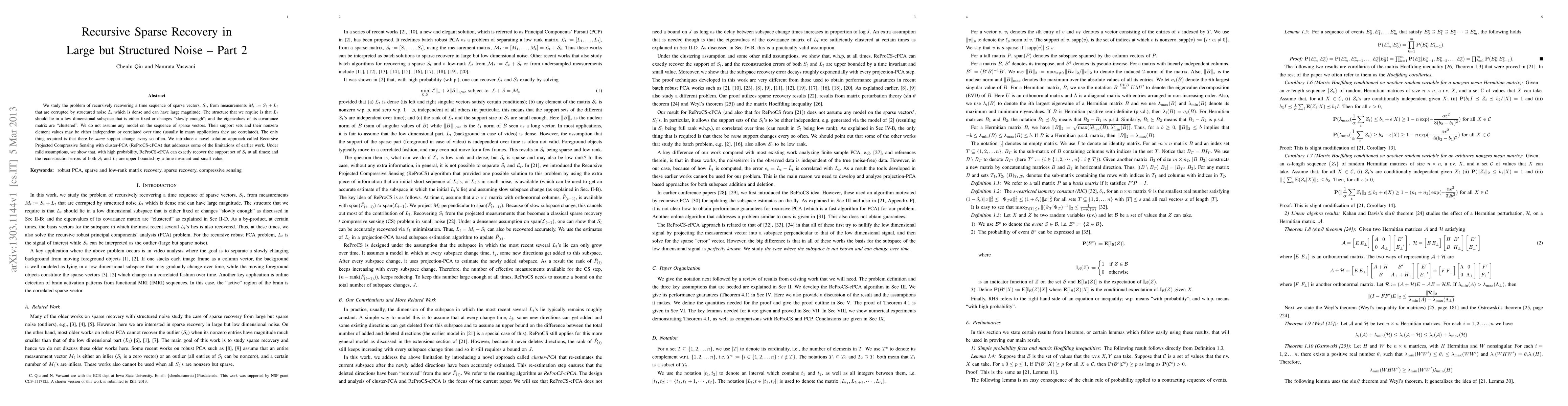 We study the problem of recursively recovering a time sequence of sparse vectors, St, from measurements Mt := St + Lt that are corrupted by structured noise Lt which is dense and can have large magnitude. The structure that we require is that Lt should lie in a low dimensional subspace that is either fixed or changes "slowly enough"; and the eigenvalues of its covariance matrix are "clustered". We do not assume any model on the sequence of sparse vectors. Their support sets and their nonzero element values may be either independent or correlated over time (usually in many applications they are correlated). The only thing required is that there be some support change every so often. We introduce a novel solution approach called Recursive Projected Compressive Sensing with cluster-PCA (ReProCS-cPCA) that addresses some of the limitations of earlier work. Under mild assumptions, we show that, with high probability, ReProCS-cPCA can exactly recover the support set of St at all times; and the reconstruction errors of both St and Lt are upper bounded by a time-invariant and small value.