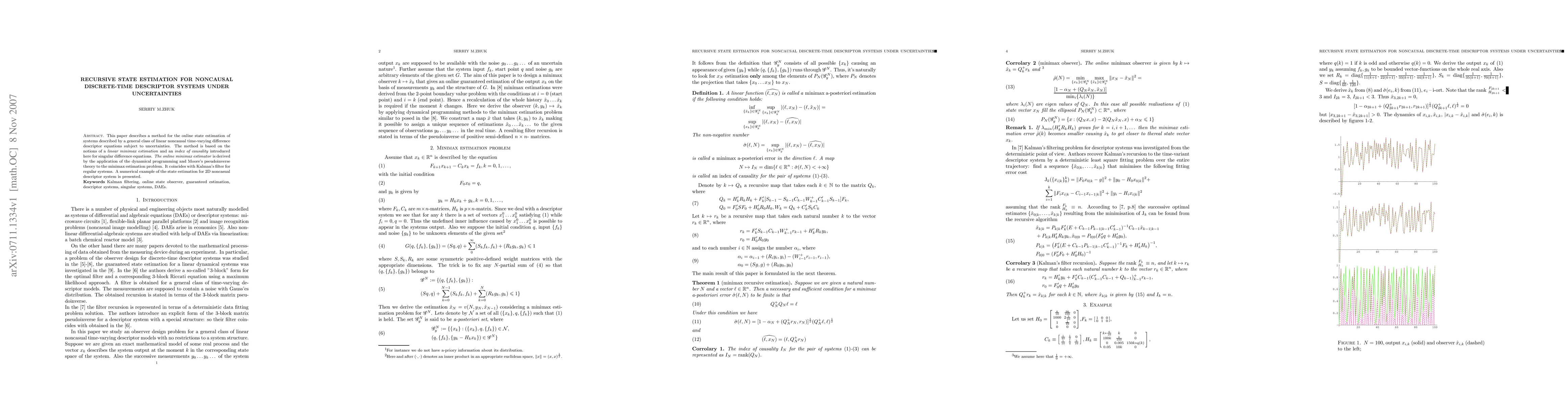 This paper describes a method for the online state estimation of systems described by a general class of linear noncausal time-varying difference descriptor equations subject to uncertainties. The method is based on the notions of a linear minimax estimation and an index of causality introduced here for singular difference equations. The online minimax estimator is derived by the application of the dynamical programming and Moore's pseudoinverse theory to the minimax estimation problem. It coincides with Kalman's filter for regular systems. A numerical example of the state estimation for 2D noncasual descriptor system is presented. Keywords: Kalman filtering, online state observer, guaranteed estimation, descriptor systems, singular systems, DAEs.