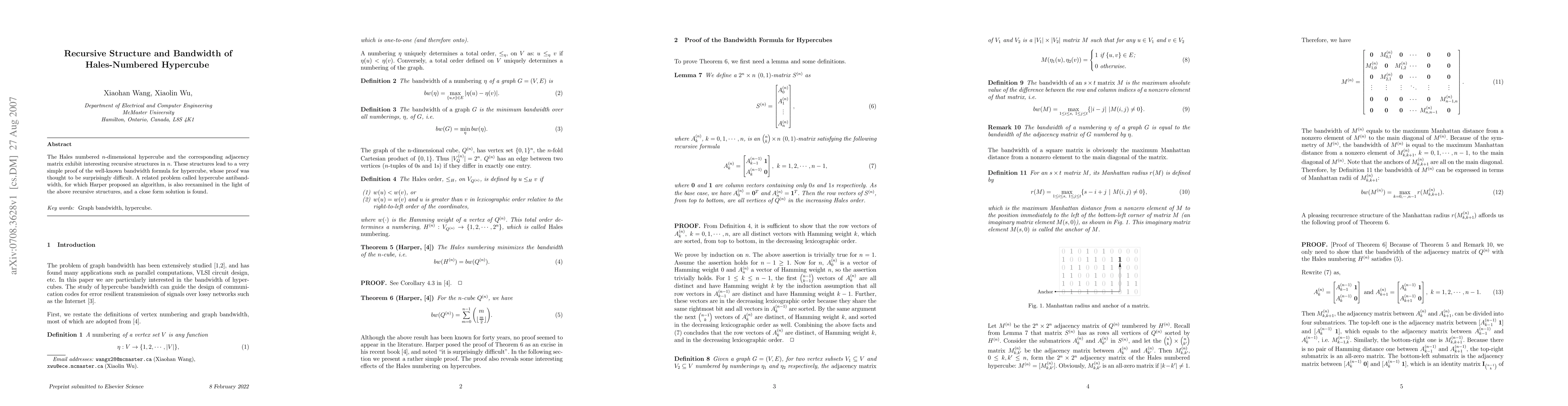 The Hales numbered $n$-dimensional hypercube and the corresponding adjacency matrix exhibit interesting recursive structures in $n$. These structures lead to a very simple proof of the well-known bandwidth formula for hypercube, whose proof was thought to be surprisingly difficult. A related problem called hypercube antibandwidth, for which Harper proposed an algorithm, is also reexamined in the light of the above recursive structures, and a close form solution is found.