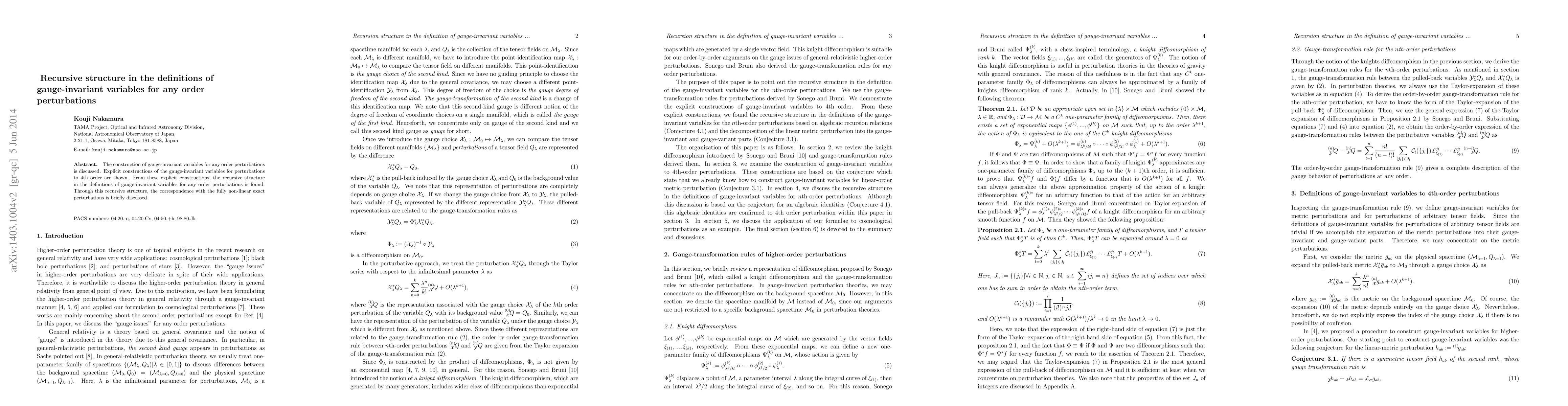 The construction of gauge-invariant variables for any order perturbations is discussed. Explicit constructions of the gauge-invariant variables for perturbations to 4th order are shown. From these explicit construction, the recursive structure in the definitions of gauge-invariant variables for any order perturbations is found. Through this recursive structure, the correspondence with the fully non-linear exact perturbations is briefly discussed.