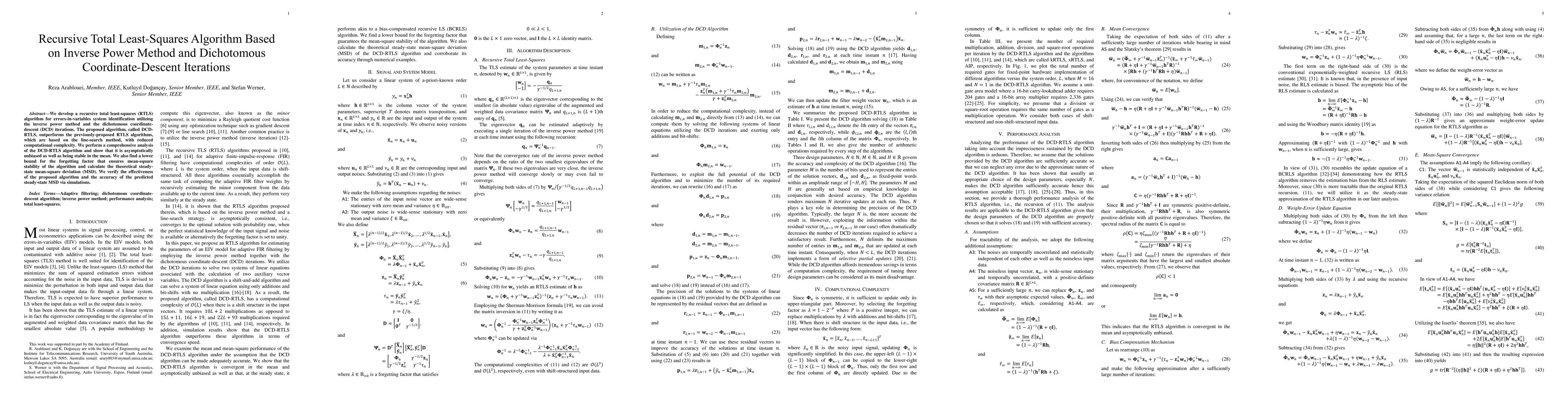 The paper proposes a recursive total least-squares (RTLS) algorithm, DCD-RTLS, using the inverse power method and dichotomous coordinate-descent iterations, which outperforms previous RTLS algorithms with lower computational complexity. The algorithm is shown to be asymptotically unbiased, stable, and its mean-square stability is analyzed theoretically.
