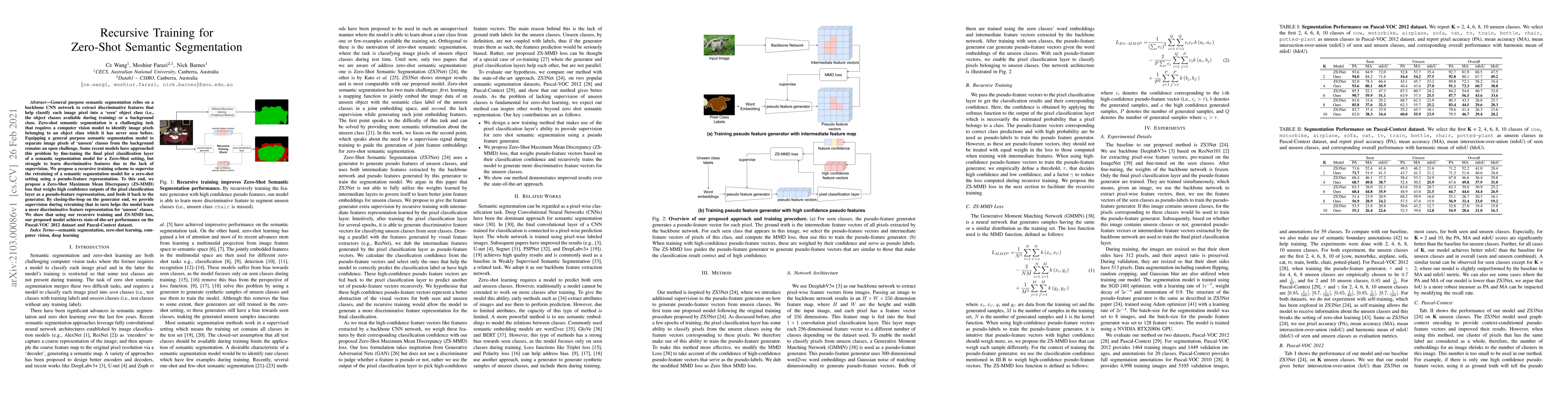 This paper introduces a recursive training scheme with a Zero-Shot Maximum Mean Discrepancy (ZS-MMD) loss for zero-shot semantic segmentation, enabling models to identify 'unseen' object classes. The method uses high confidence outputs as pseudo-features to guide model retraining, achieving state-of-the-art results on Pascal-VOC 2012 and Pascal-Context datasets.