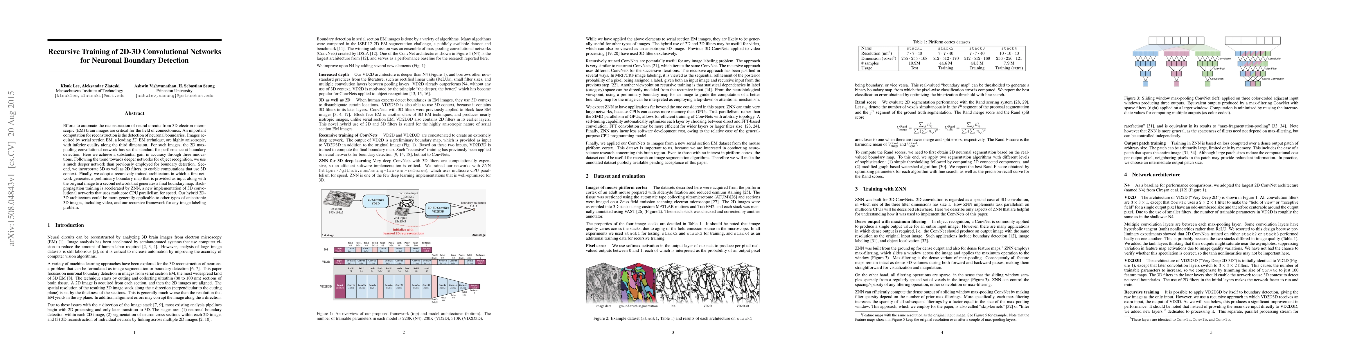 This paper proposes a hybrid 2D-3D convolutional network with recursive training to improve neuronal boundary detection in 3D electron microscopic images, achieving higher accuracy through deeper networks, 3D context incorporation, and a novel recursive training framework. The method leverages ZNN for accelerated backpropagation training.