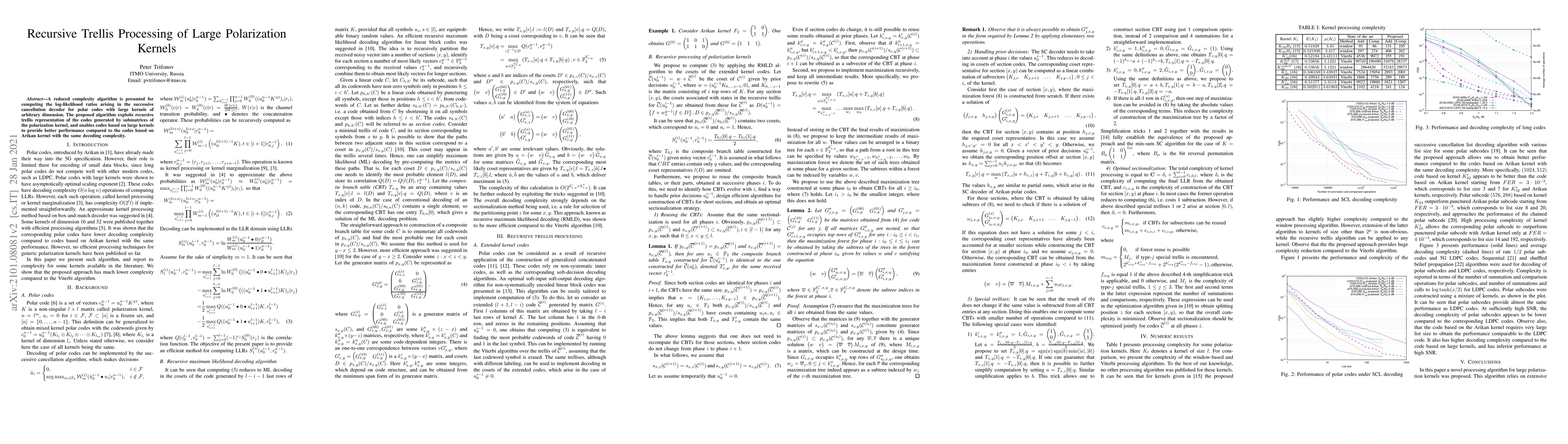 This paper introduces a reduced complexity algorithm for computing log-likelihood ratios in polar codes using large polarization kernels. It leverages recursive trellis processing to achieve better performance than traditional Arikan kernel-based codes at the same decoding complexity.