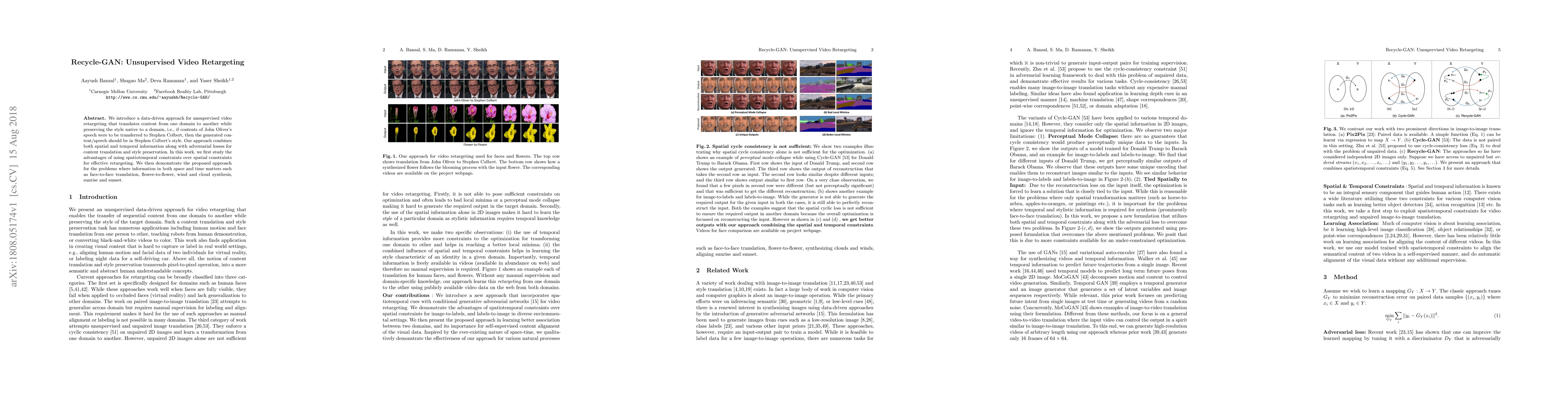 Recycle-GAN employs an unsupervised method for video retargeting that translates content across domains while maintaining the original style. The approach leverages spatiotemporal constraints and adversarial losses to achieve effective content translation and style preservation, demonstrating its utility in various applications like face-to-face translation and cloud synthesis.
