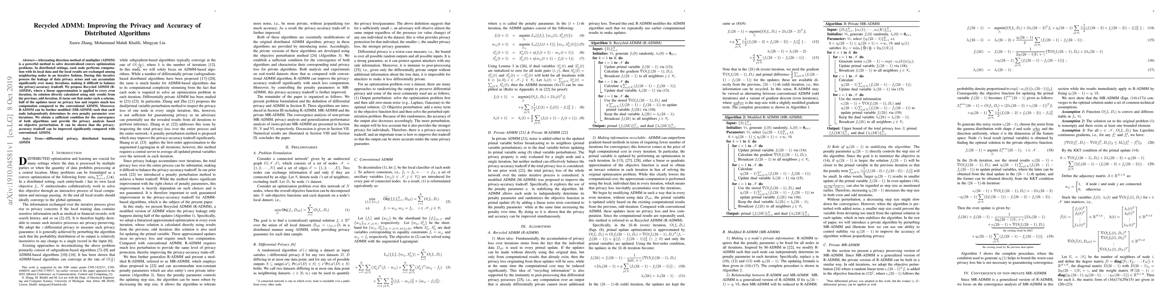 The Recycled ADMM (R-ADMM) method enhances the privacy and accuracy of distributed algorithms by applying a linear approximation in even iterations to reduce privacy leakage and computational cost. An improved version, Modified Recycled ADMM (MR-ADMM), allows nodes to independently adjust their penalty parameters, further optimizing the privacy-accuracy tradeoff.