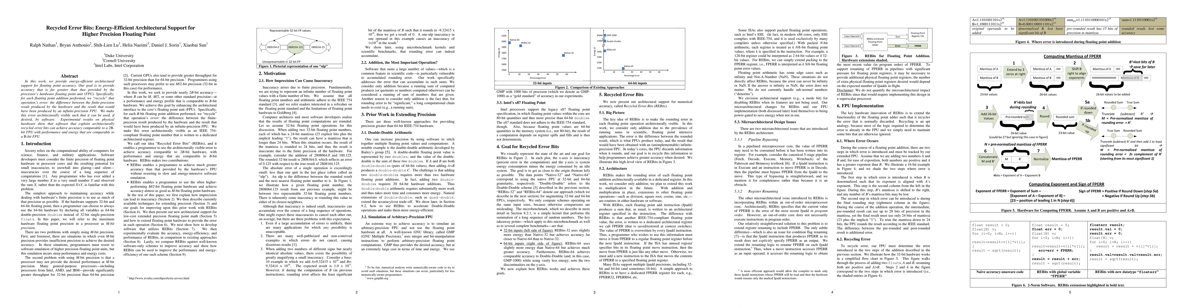 In this work, we provide energy-efficient architectural support for floating point accuracy. Our goal is to provide accuracy that is far greater than that provided by the processor's hardware floating point unit (FPU). Specifically, for each floating point addition performed, we "recycle" that operation's error: the difference between the finite-precision result produced by the hardware and the result that would have been produced by an infinite-precision FPU. We make this error architecturally visible such that it can be used, if desired, by software. Experimental results on physical hardware show that software that exploits architecturally recycled error bits can achieve accuracy comparable to a 2B-bit FPU with performance and energy that are comparable to a B-bit FPU.