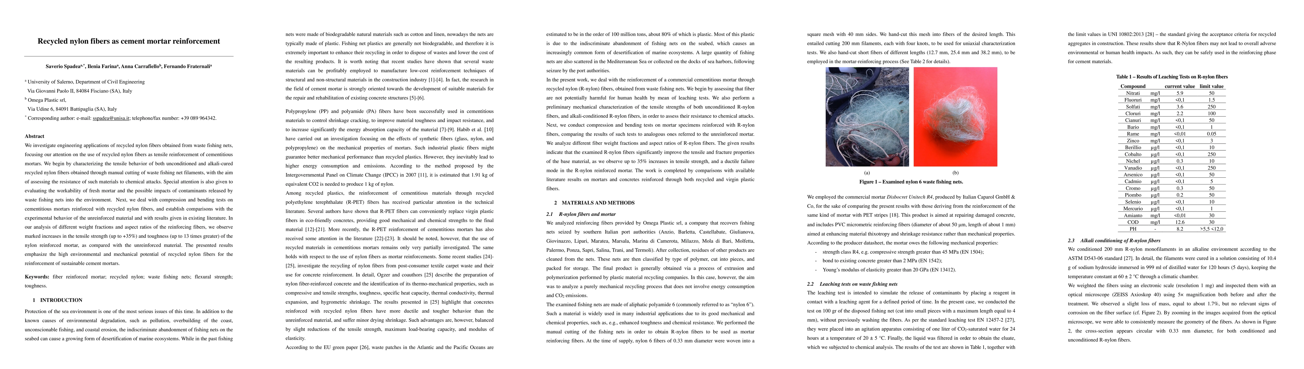 This study explores the use of recycled nylon fibers from waste fishing nets to reinforce cement mortars, finding significant increases in tensile strength and toughness. The research highlights the environmental and mechanical benefits of using such sustainable materials for construction.