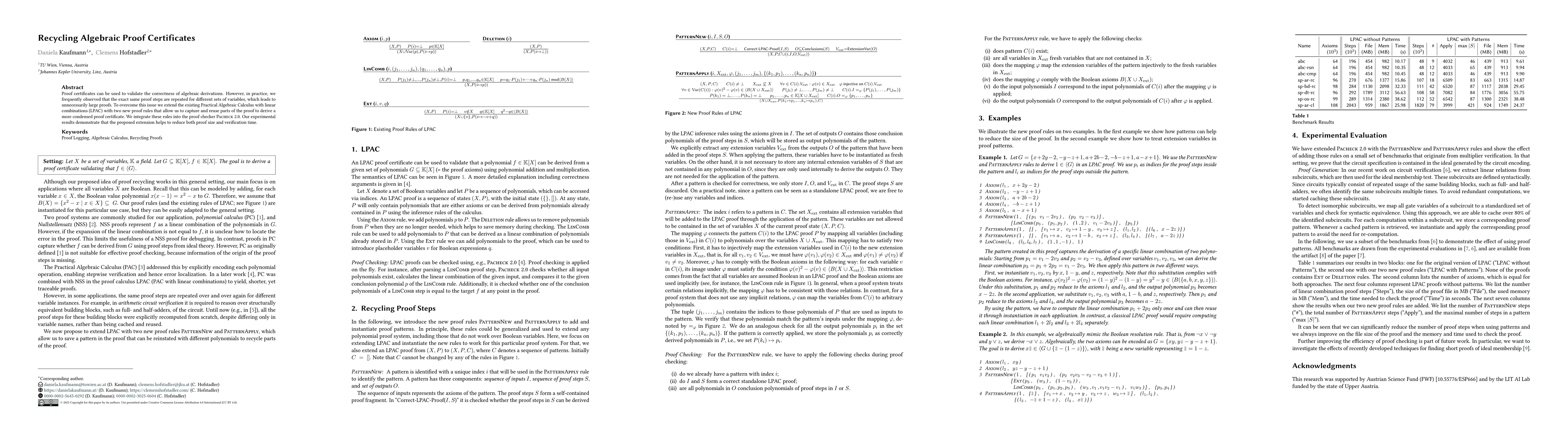 This research introduces new proof rules in Practical Algebraic Calculus (LPAC) that enable reusing parts of proofs, reducing proof size and verification time. These rules are implemented in Pacheck 2.0, demonstrating significant improvements in experimental results.