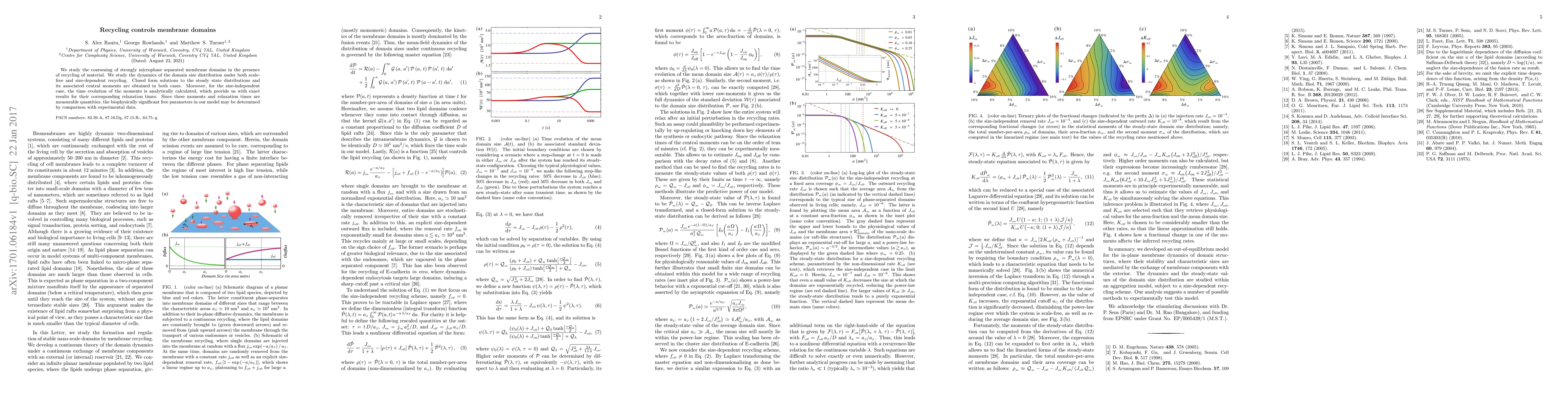 We study the coarsening of strongly microphase separated membrane domains in the presence of recycling of material. We study the dynamics of the domain size distribution under both scale-free and size-dependent recycling. Closed form solutions to the steady state distributions and its associated central moments are obtained in both cases. Moreover, for the size-independent case, the~time evolution of the moments is analytically calculated, which provide us with exact results for their corresponding relaxation times. Since these moments and relaxation times are measurable quantities, the biophysically significant free parameters in our model may be determined by comparison with experimental data.