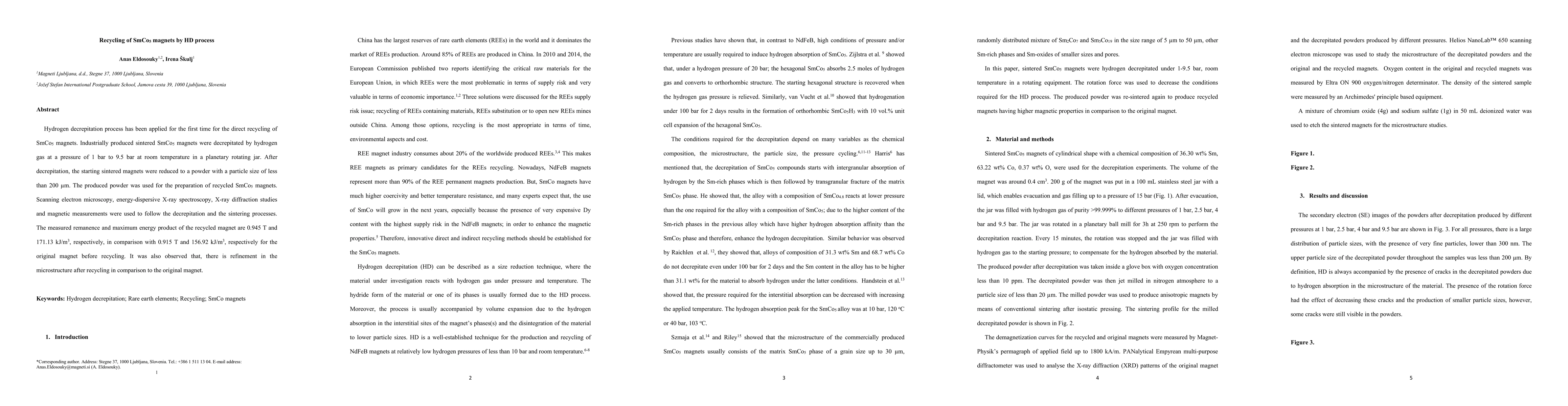 Hydrogen decrepitation process has been applied for the first time for the direct recycling of SmCo5 magnets. Industrially produced sintered SmCo5 magnets were decrepitated by hydrogen gas at a pressure of 1 bar to 9.5 bar at room temperature in a planetary rotating jar. After decrepitation, the starting sintered magnets were reduced to a powder with a particle size of less than 200 microns. The produced powder was used for the preparation of recycled SmCo5 magnets. Scanning electron microscopy, energy-dispersive X-ray spectroscopy, X-ray diffraction studies and magnetic measurements were used to follow the decrepitation and the sintering processes. The measured remanence and maximum energy product of the recycled magnet are 0.94 T and 171.1 kJ/m3, respectively, in comparison with 0.91 T and 156.8 kJ/m3, respectively for the original magnet before recycling. It was also observed that, there is refinement in the microstructure after recycling in comparison to the original magnet.