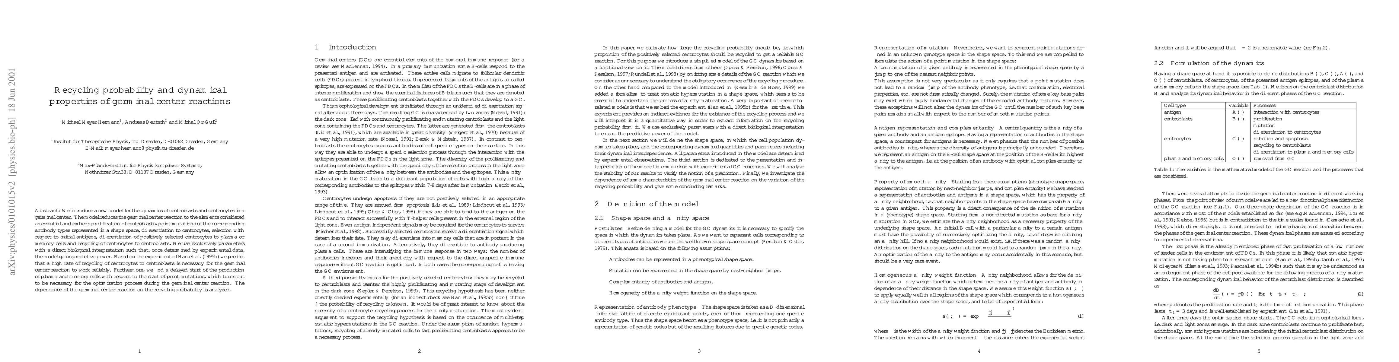 We introduce a new model for the dynamics of centroblasts and centrocytes in a germinal center. The model reduces the germinal center reaction to the elements considered as essential and embeds proliferation of centroblasts, point mutations of the corresponding antibody types represented in a shape space, differentiation to centrocytes, selection with respect to initial antigens, differentiation of positively selected centrocytes to plasma or memory cells and recycling of centrocytes to centroblasts. We use exclusively parameters with a direct biological interpretation such that, once determined by experimental data, the model gains predictive power. Based on the experiment of Han et al. (1995b) we predict that a high rate of recycling of centrocytes to centroblasts is necessary for the germinal center reaction to work reliably. Furthermore, we find a delayed start of the production of plasma and memory cells with respect to the start of point mutations, which turns out to be necessary for the optimization process during the germinal center reaction. The dependence of the germinal center reaction on the recycling probability is analyzed.