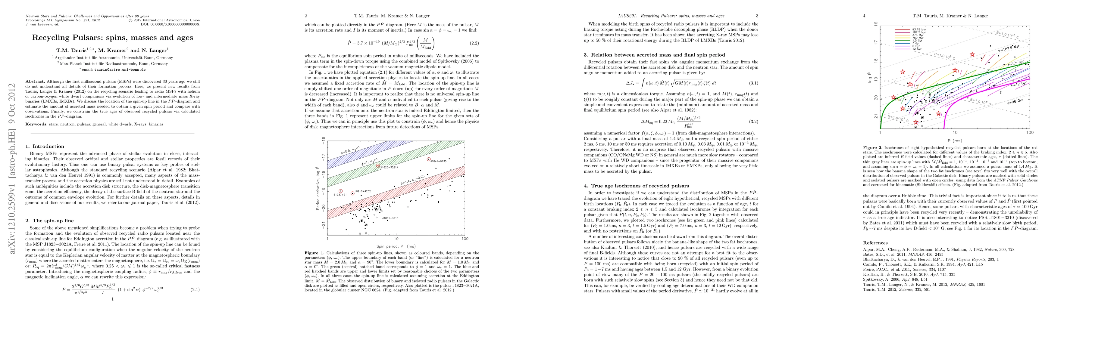 Although the first millisecond pulsars (MSPs) were discovered 30 years ago we still do not understand all details of their formation process. Here, we present new results from Tauris, Langer & Kramer (2012) on the recycling scenario leading to radio MSPs with helium or carbon-oxygen white dwarf companions via evolution of low- and intermediate mass X-ray binaries (LMXBs, IMXBs). We discuss the location of the spin-up line in the (P,Pdot)-diagram and estimate the amount of accreted mass needed to obtain a given spin period and compare with observations. Finally, we constrain the true ages of observed recycled pulsars via calculated isochrones in the (P,Pdot)-diagram.
