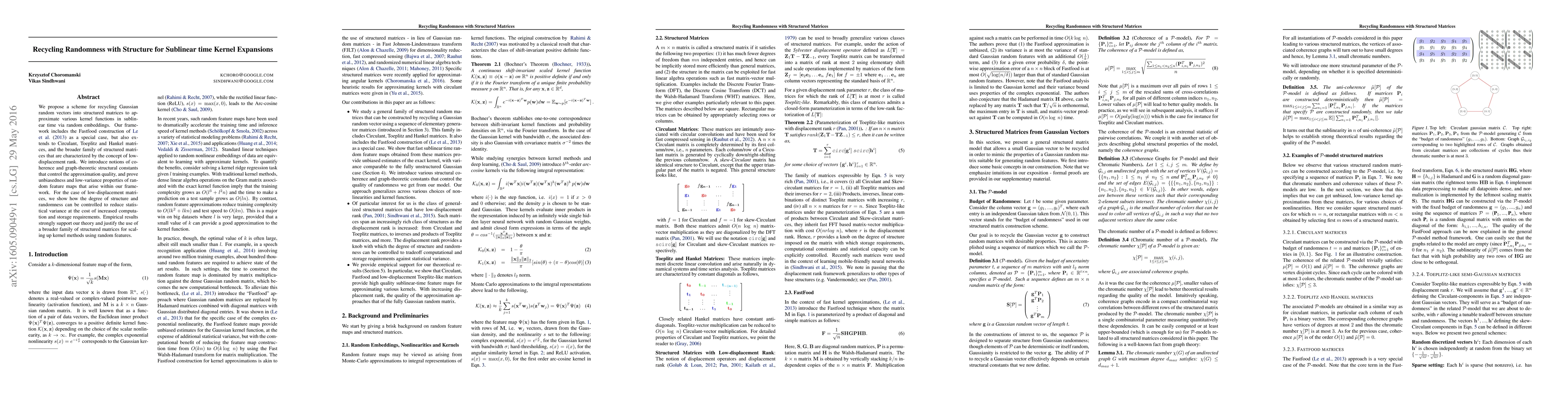 We propose a scheme for recycling Gaussian random vectors into structured matrices to approximate various kernel functions in sublinear time via random embeddings. Our framework includes the Fastfood construction as a special case, but also extends to Circulant, Toeplitz and Hankel matrices, and the broader family of structured matrices that are characterized by the concept of low-displacement rank. We introduce notions of coherence and graph-theoretic structural constants that control the approximation quality, and prove unbiasedness and low-variance properties of random feature maps that arise within our framework. For the case of low-displacement matrices, we show how the degree of structure and randomness can be controlled to reduce statistical variance at the cost of increased computation and storage requirements. Empirical results strongly support our theory and justify the use of a broader family of structured matrices for scaling up kernel methods using random features.