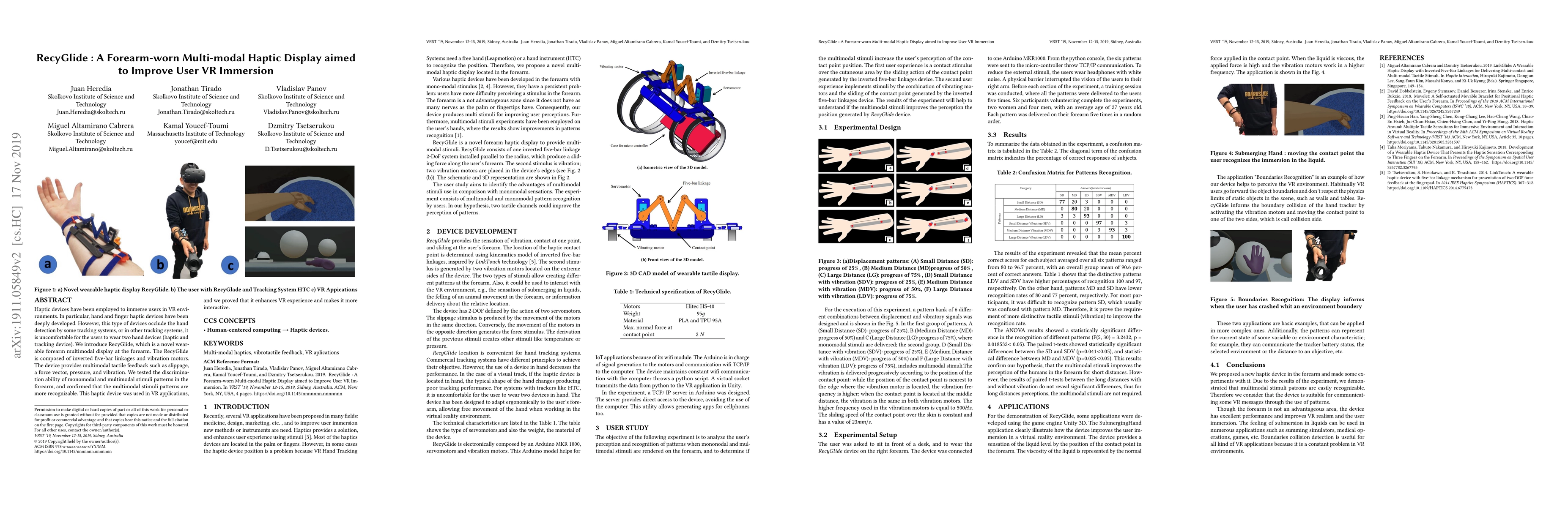 RecyGlide is a novel forearm-worn multi-modal haptic display that enhances VR immersion by providing tactile feedback without obstructing hand tracking. The device's multimodal feedback improves pattern recognition and increases interactivity in VR applications.