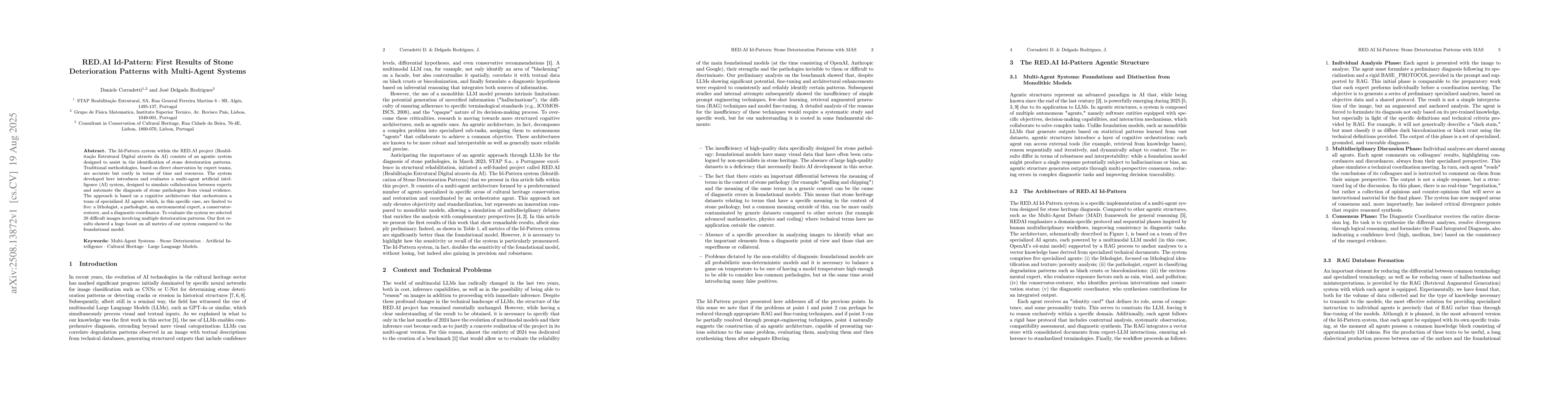 The RED.AI Id-Pattern system introduces a multi-agent artificial intelligence approach for stone deterioration pattern diagnosis, utilizing a cognitive architecture that orchestrates specialized AI agents and a RAG process for knowledge grounding.