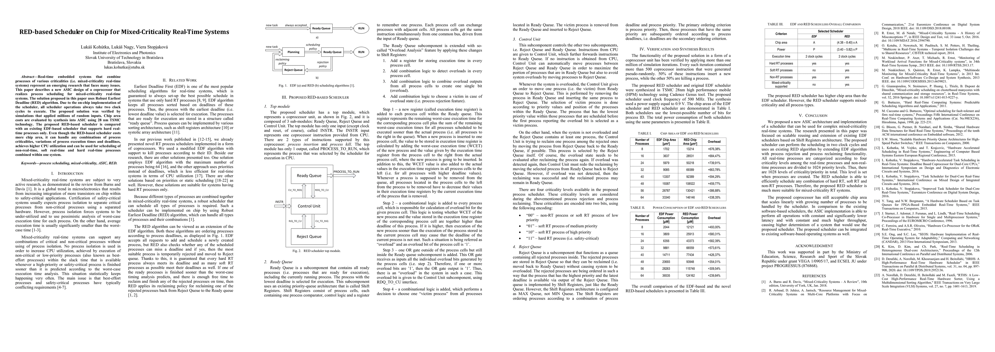 This paper presents an ASIC coprocessor using a Robust Earliest Deadline (RED) algorithm for scheduling mixed-criticality real-time processes, achieving higher CPU utilization and flexibility across various process types, despite higher chip area costs compared to an EDF-based scheduler.