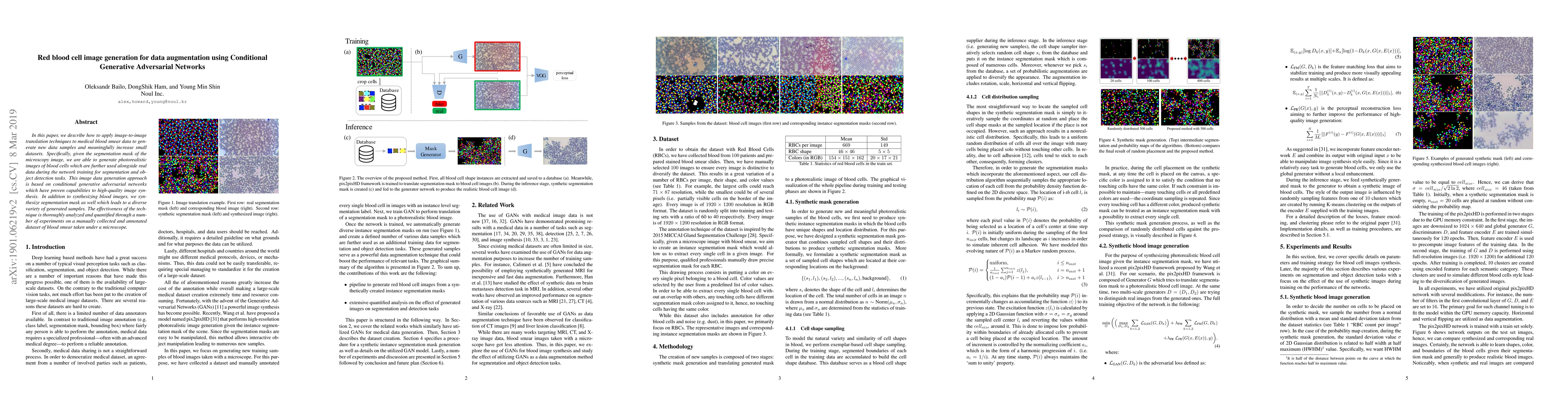 This paper utilizes conditional generative adversarial networks (GANs) to generate photorealistic red blood cell images and corresponding segmentation masks from microscopy data, enhancing small datasets for segmentation and object detection tasks. The effectiveness of the method is validated through experiments on a manually annotated blood smear dataset.