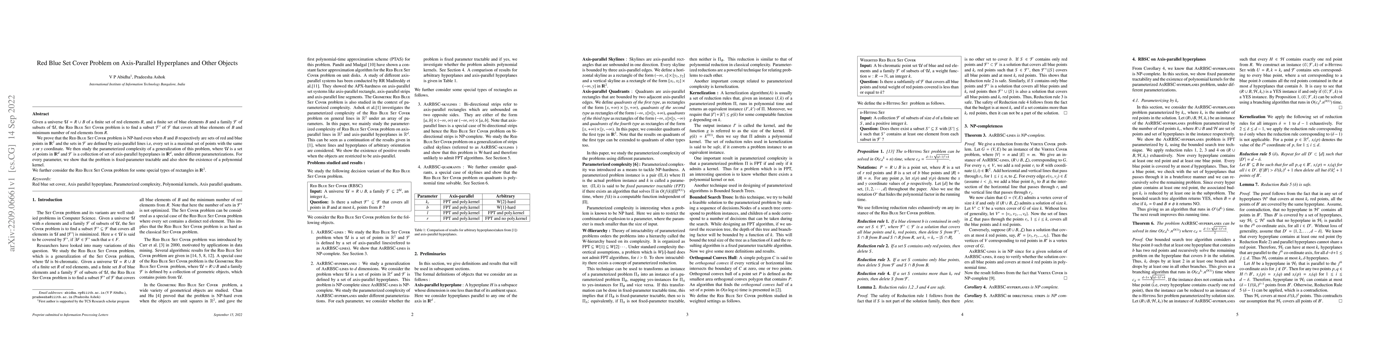 Given a universe $\mathcal{U}=R \cup B$ of a finite set of red elements $R$, and a finite set of blue elements $B$ and a family $\mathcal{F}$ of subsets of $\mathcal{U}$, the \RBSC problem is to find a subset $\mathcal{F}'$ of $\mathcal{F}$ that covers all blue elements of $B$ and minimum number of red elements from $R$. We prove that the \RBSC problem is NP-hard even when $R$ and $B$ respectively are sets of red and blue points in ${\rm I\!R}^2$ and the sets in $\mathcal{F}$ are defined by axis-parallel lines i.e, every set is a maximal set of points with the same $x$ or $y$ coordinate. We then study the parameterized complexity of a generalization of this problem, where $\mathcal{U}$ is a set of points in ${\rm I\!R}^d$ and $\mathcal{F}$ is a collection of set of axis-parallel hyperplanes in ${\rm I\!R}^d$, under different parameterizations. For every parameter, we show that the problem is fixed-parameter tractable and also show the existence of a polynomial kernel. We further consider the \RBSC problem for some special types of rectangles in ${\rm I\!R}^2$.